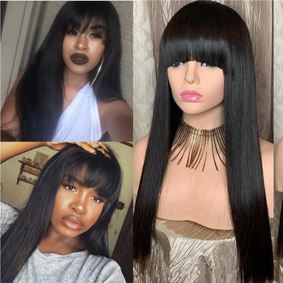 Парик из 100% натуральных волос с челкой, бразильский, прямой, черный, длиной 30 дюймов, короткий, короткий, парик из натуральных волос для чернокожих женщин