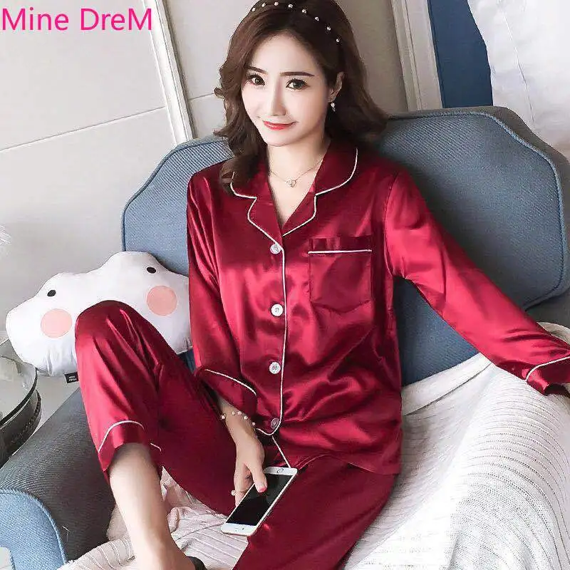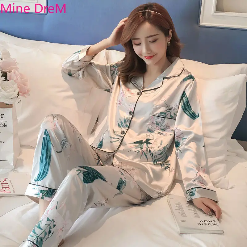 Женские атласные шелковые пижамные комплекты, весенняя одежда для сна из искусственного шелка с цветочным принтом, рубашка с длинным рукавом и брюки, 2 предмета