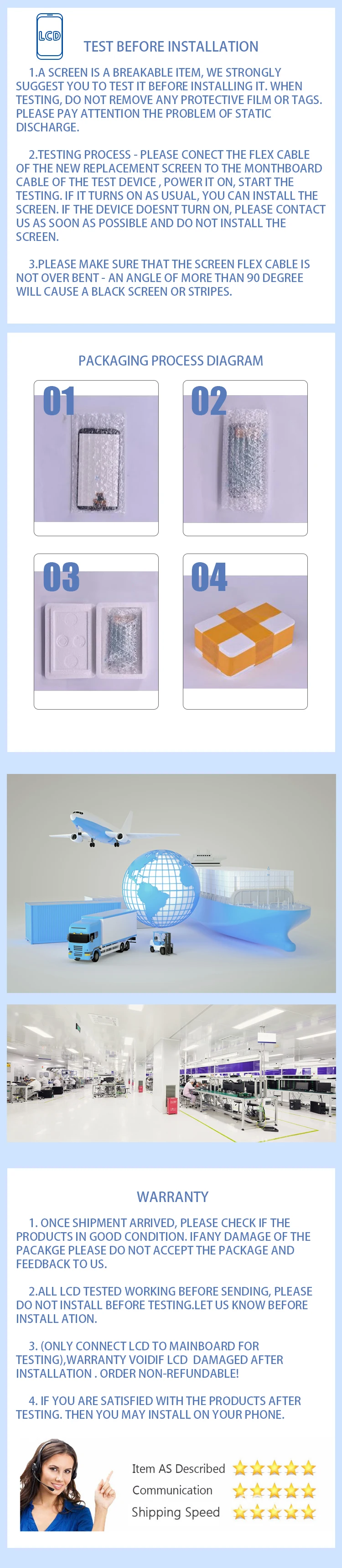 1. Установка: рекомендуется использовать специальные инструменты и выполнять профессиональные операции. 2. Перед размещением заказа: Проверьте модель вашего телефона и внимательно прочитайте соответствующую информацию. 3. Перед установкой: так как замена экрана является хрупкой, лучше всего попробовать это. 4. Процесс тестирования: во-первых, подключите Новый гибкий кабель для замены дисплея к материнской плате, проверьте телефонную линию, подключите питание и начните тест. Помню во время тестов не снимают никакой защитной пленки или этикетки и обращают внимание на статическое электричество. 5. Результаты теста: если результаты теста верны, вы можете установить его; В противном случае, свяжитесь с нами как можно скорее.