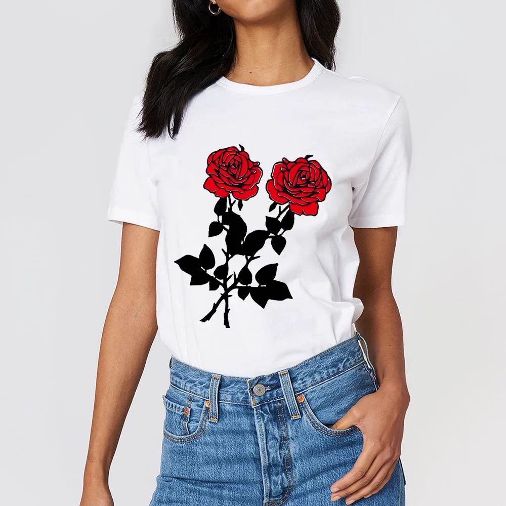 2021 Новая модная женская обувь с принтом (розы); Платье с цветочным принтом эстетику для женщин Футболка короткий рукав женская футболка Повседневная футболка femme mujer