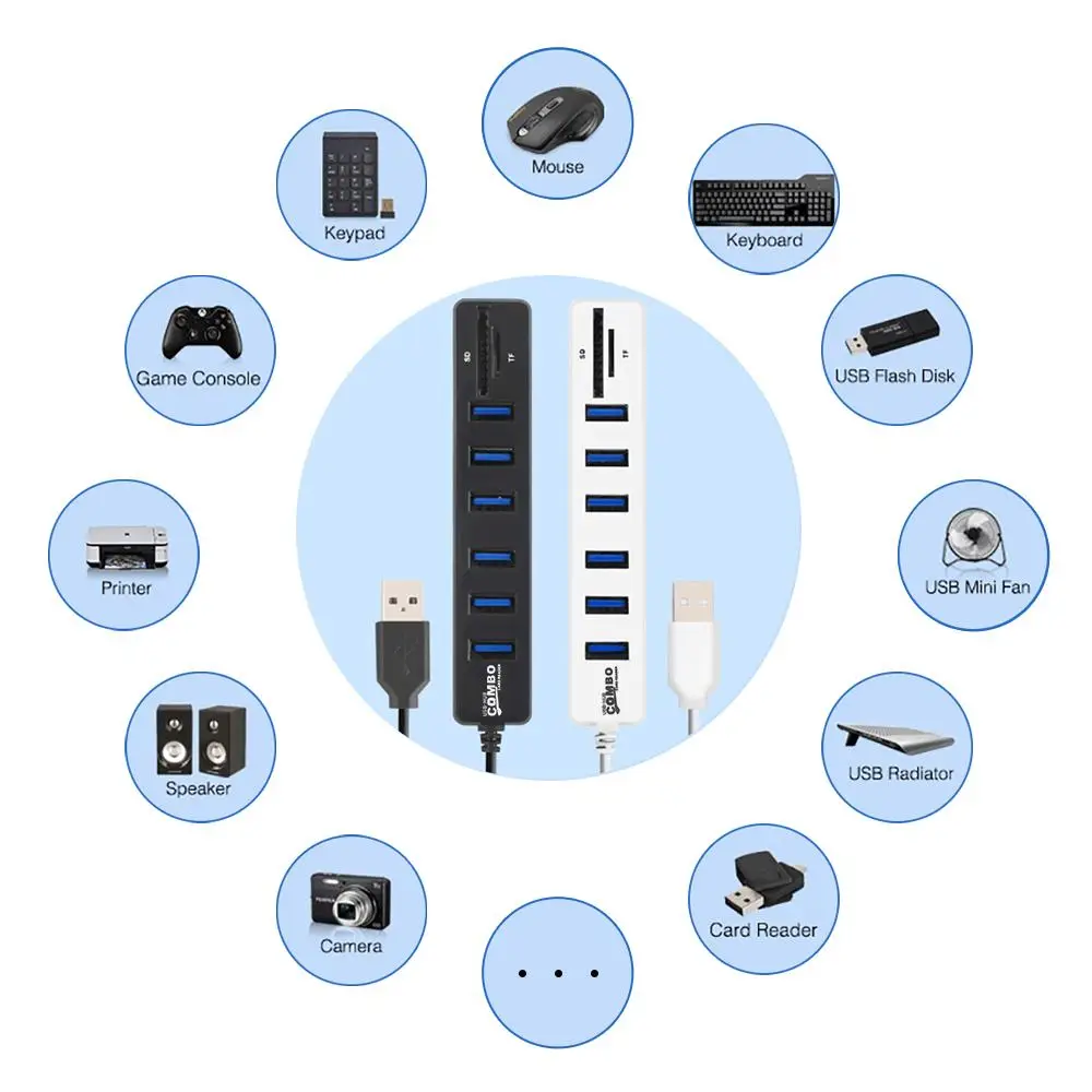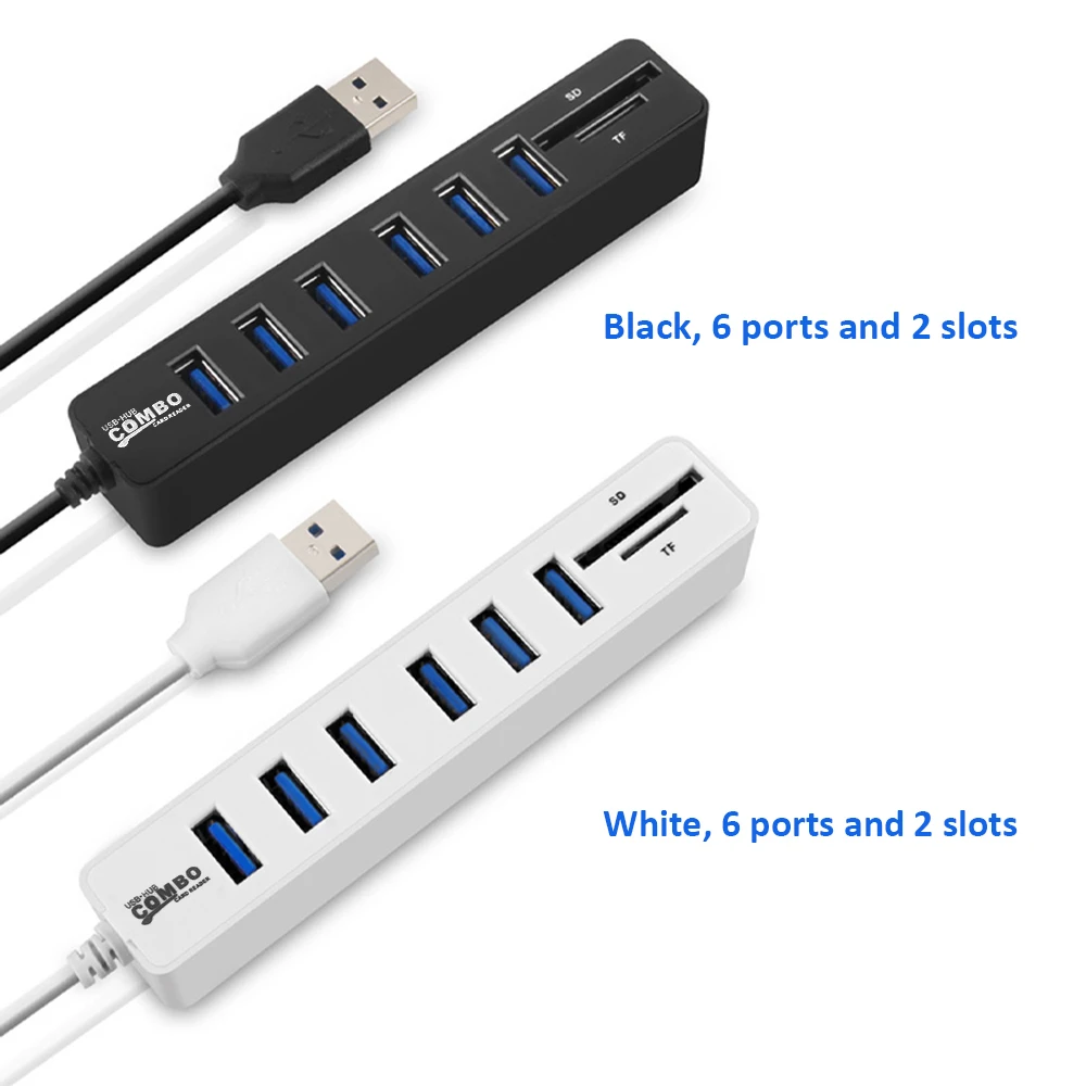 Характеристики:-Название товара: комбо usb-хаб-Тип USB: USB 2,0-Скорость передачи данных: до 480 Мбит/с-Порты USB: 6 портов/3 порта-Кардридер: для SD/TF(Micro SD) карты-Кабель Длина: 6 Порты около 0,9 M/3 Порты около 0,1 м-Размер: 121D * 22W * 20H мм-Цвет: черный-Материал: корпус из АБС-пластика-Мощность: 5 В/500 мА-Совместимость: Windows XP/2000/Vista/WIN 7/8/10, для Mac OS и т. д.