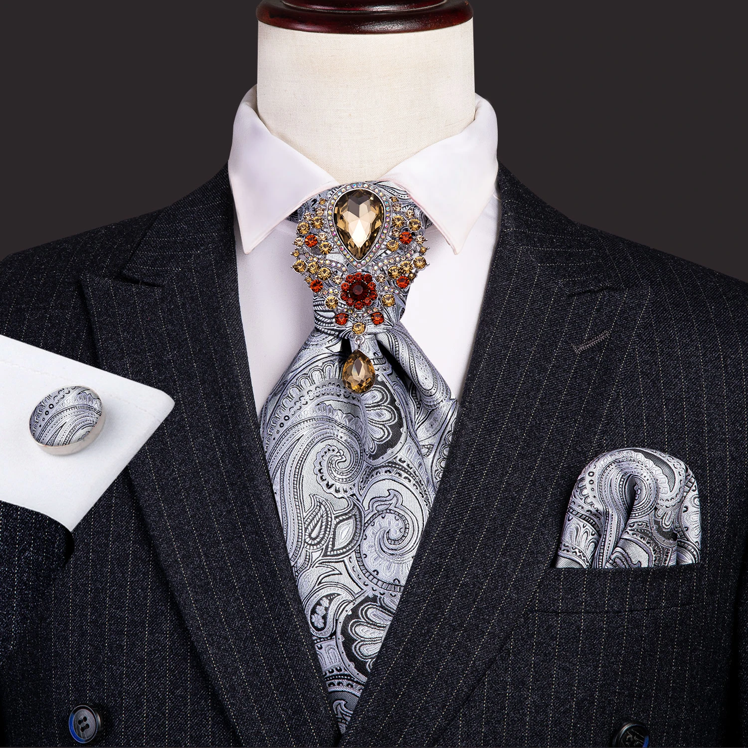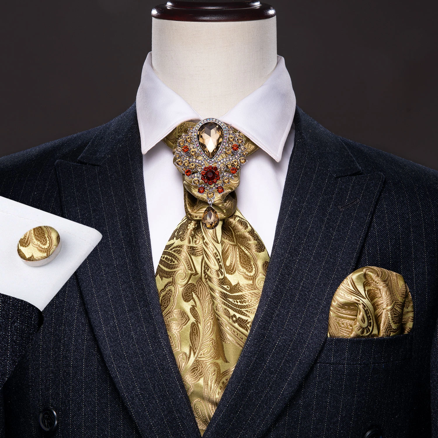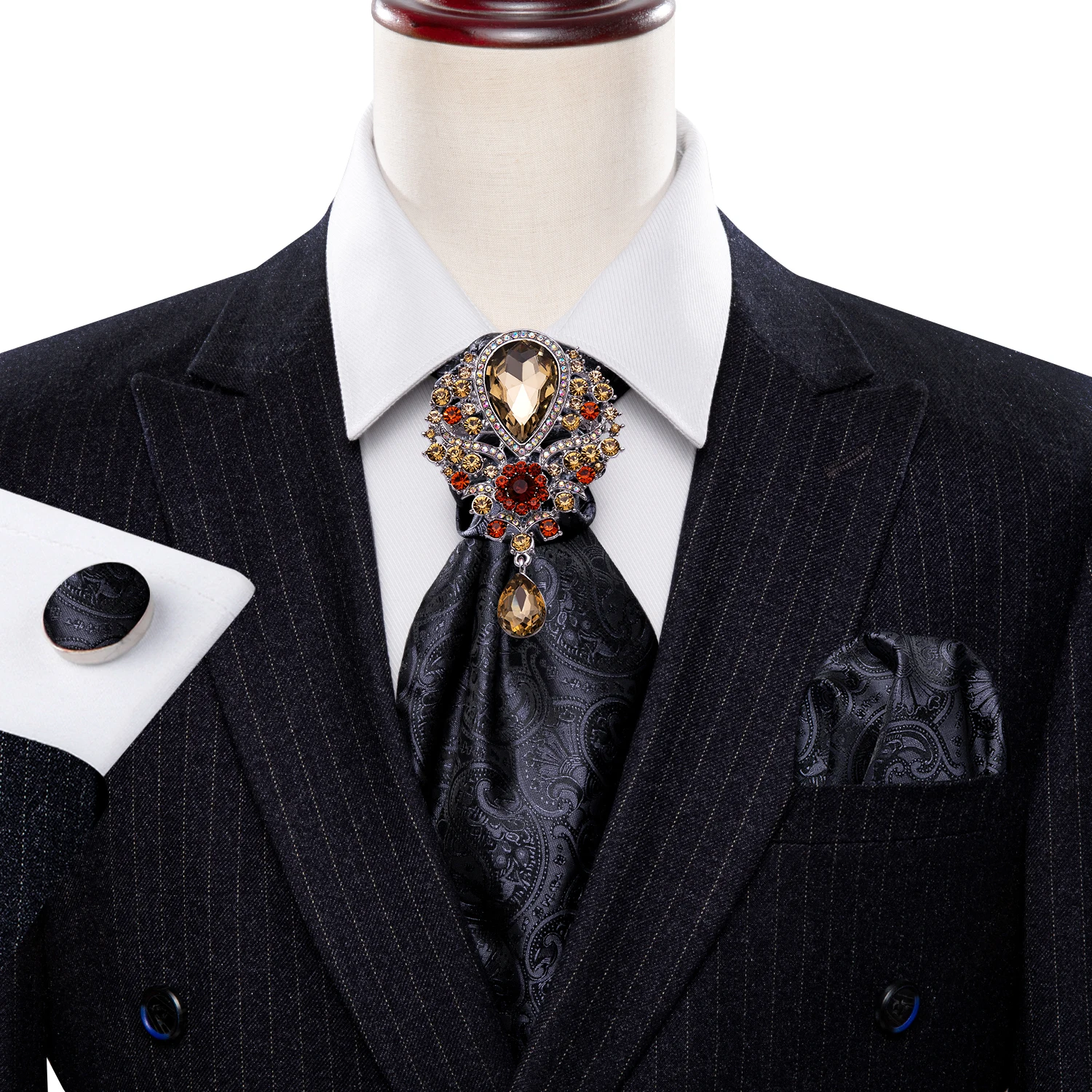 Черный золотой Шелковый мужской галстук Аскот галстук запонки набор стразы брошь в британском стиле официальные джентльмены Свадьба Барри Ван