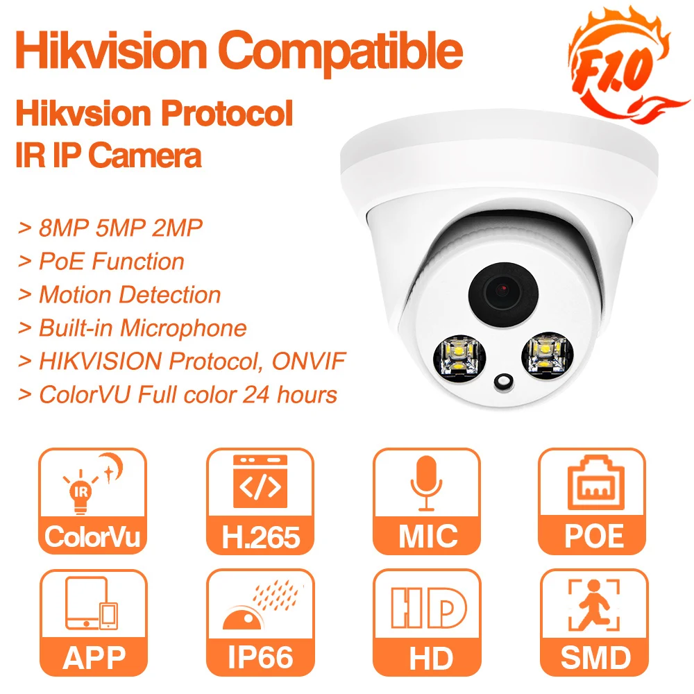 Совместимая с Hikvision IP-камера 8 МП 4K купольная PoE полноцветная дневная и Ночная камера видеонаблюдения 5 Мп 2 МП цветная Vu Встроенный микрофон Onvif IP66