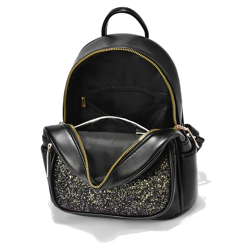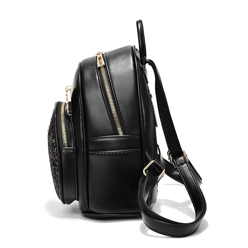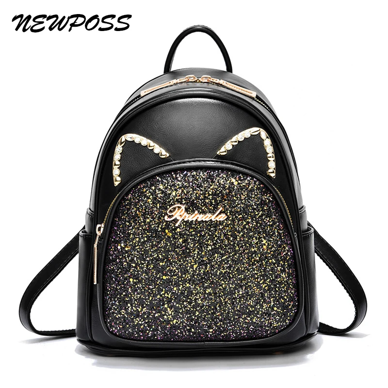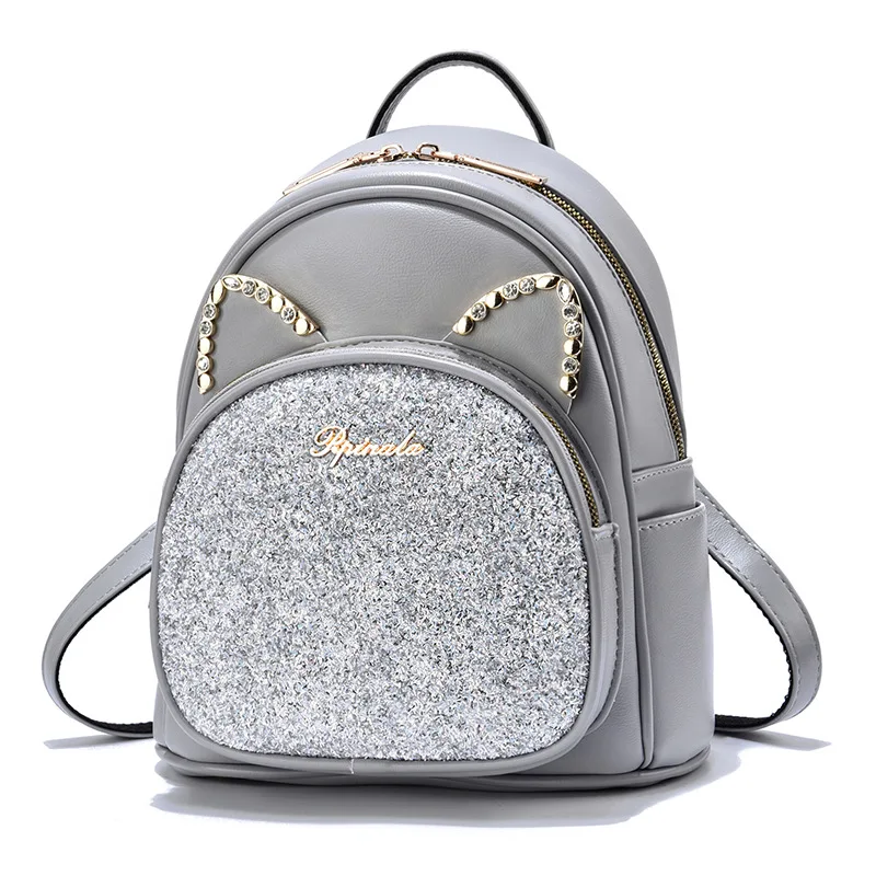 Рюкзак женский кожаный, стразы 2021, с блестками и изображением кошки