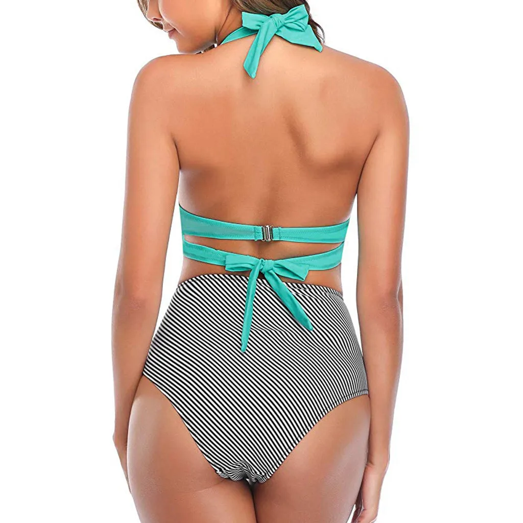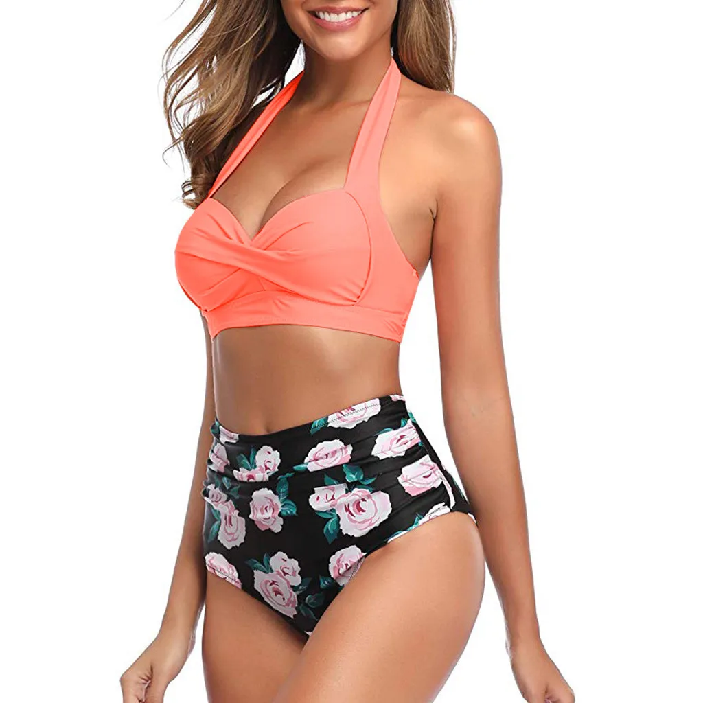 Сексуальное бикини, Женский винтажный раздельный купальник, ретро Холтер с рюшами и высокой талией, комплект бикини, купальные костюмы, женский