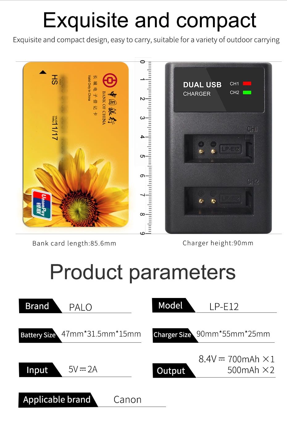 PALO LP-E12 2-ячейка LCD USB двойная цифровая камера зарядное устройство для Canon M 100D Kiss X7 Rebel SL1 EOS M10 EOS M50 DSLR