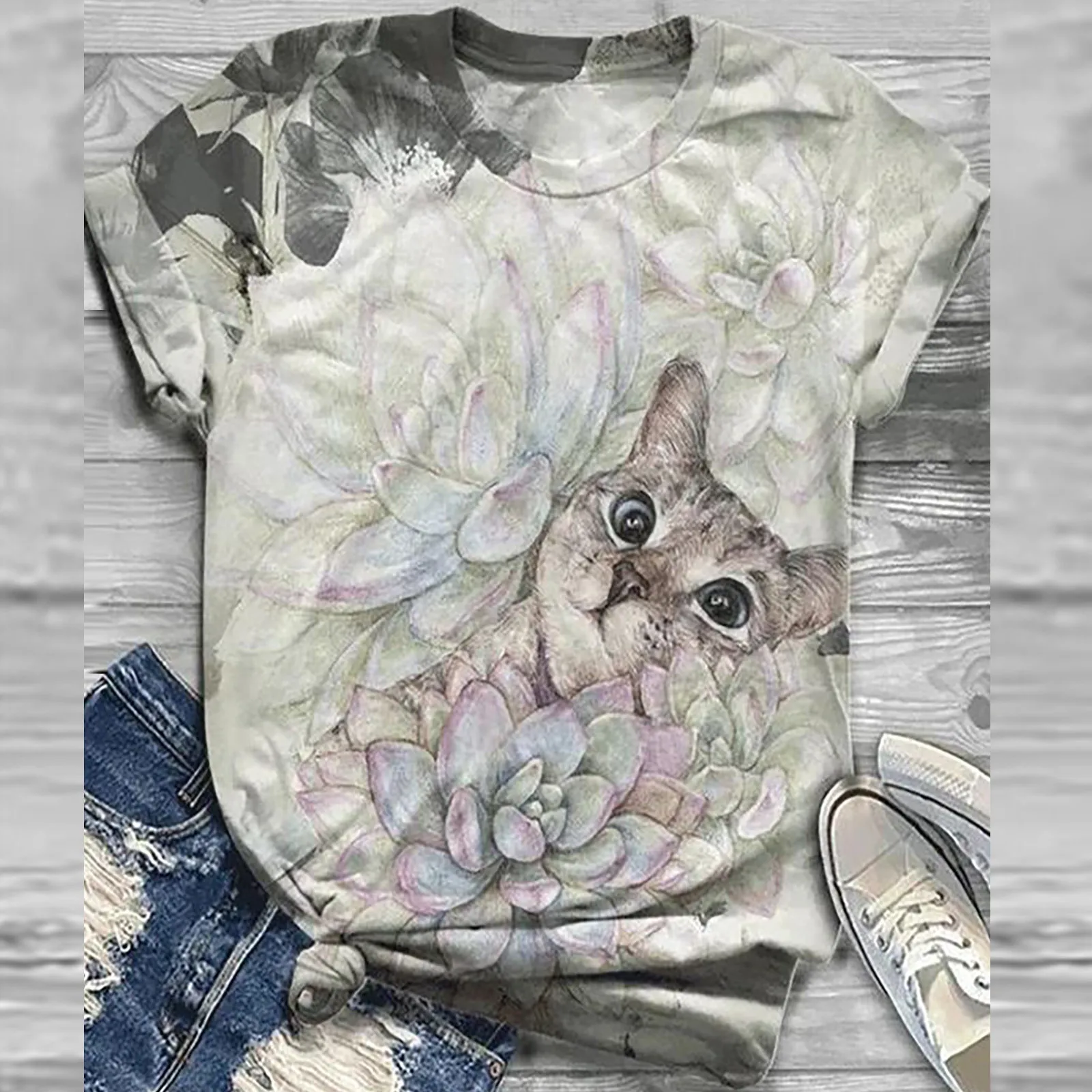 Женские футболки в стиле Харадзюку, топы для женщин, летние футболки с коротким рукавом и 3D-принтом животных, топы с круглым вырезом, футболка, женские футболки