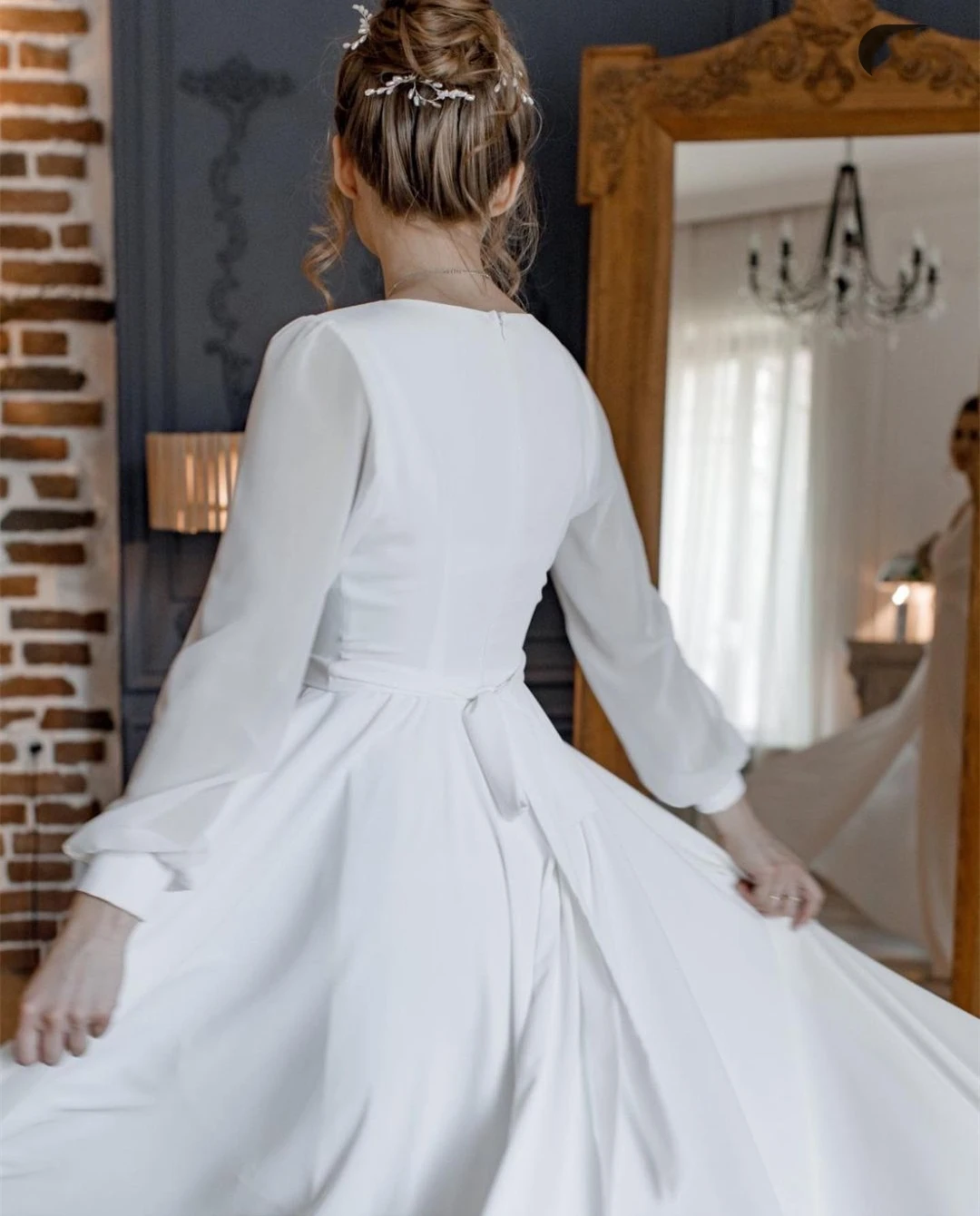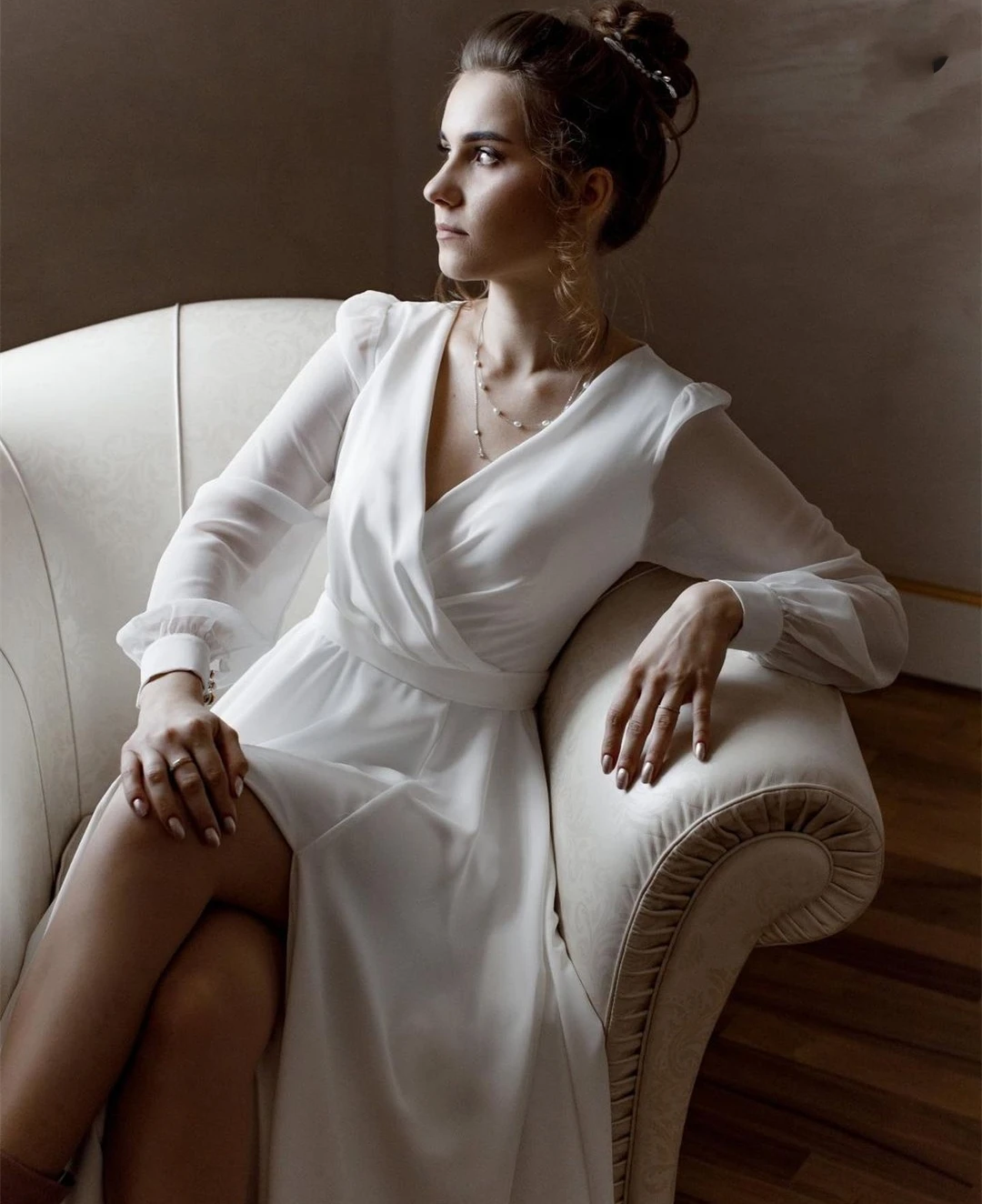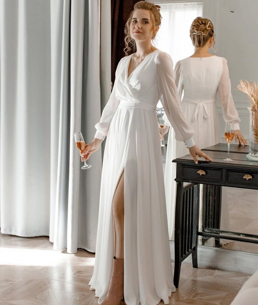 Шифоновое свадебное платье цвета слоновой кости в стиле бохо, трапециевидного силуэта с длинным рукавом, разрезом по бокам, V-образным вырезом, очаровательное платье