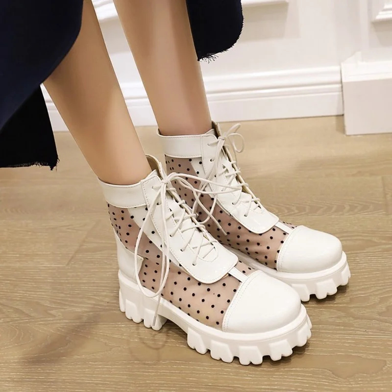 Ботинки женские весенне-летние из лакированной кожи, на толстой подошве, сетчатые, со шнуровкой