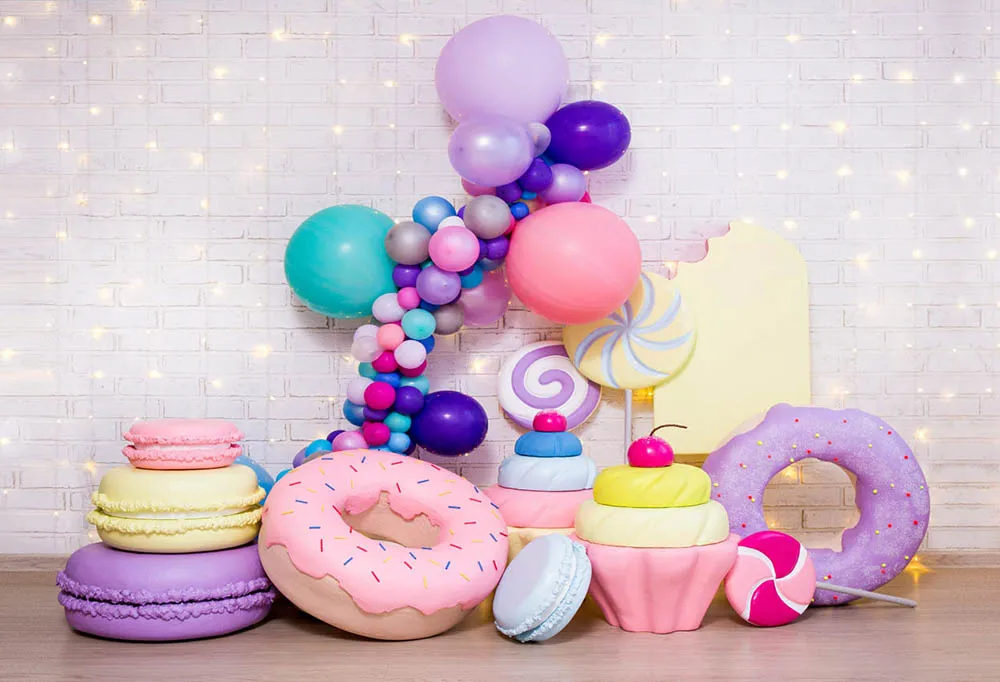 Фон для фотосъемки с изображением Макарон пончиков мороженого красочный воздушный шар белая кирпичная стена фон для фотосъемки детский торт разбитое фото