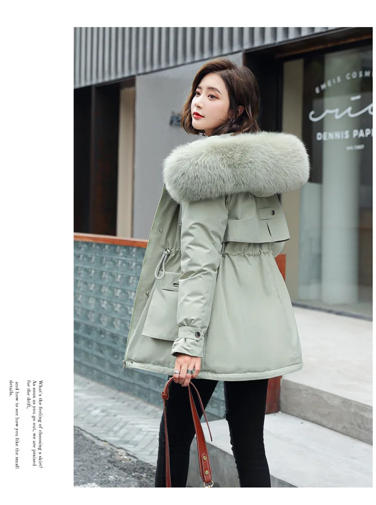 Женская Вельветовая подкладка, утепленная парка с капюшоном, женская тонкая верхняя одежда с большим меховым воротником, осенне-зимняя куртка, Женское пальто, парка для женщин