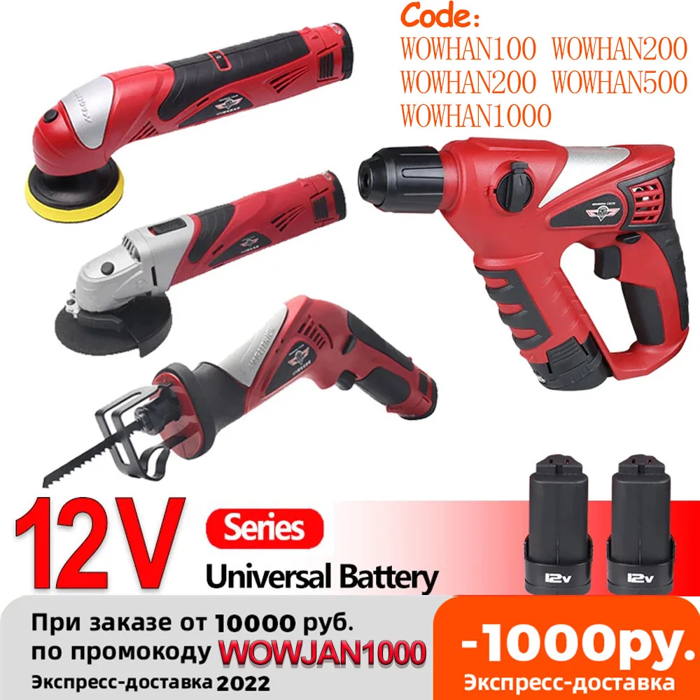 Аккумуляторная ударная дрель М10, шлифовальная машинка 4 в 1, полировальные инструменты, лобзик для резки дерева с литиевой батареей 12 в 2,0 Ач