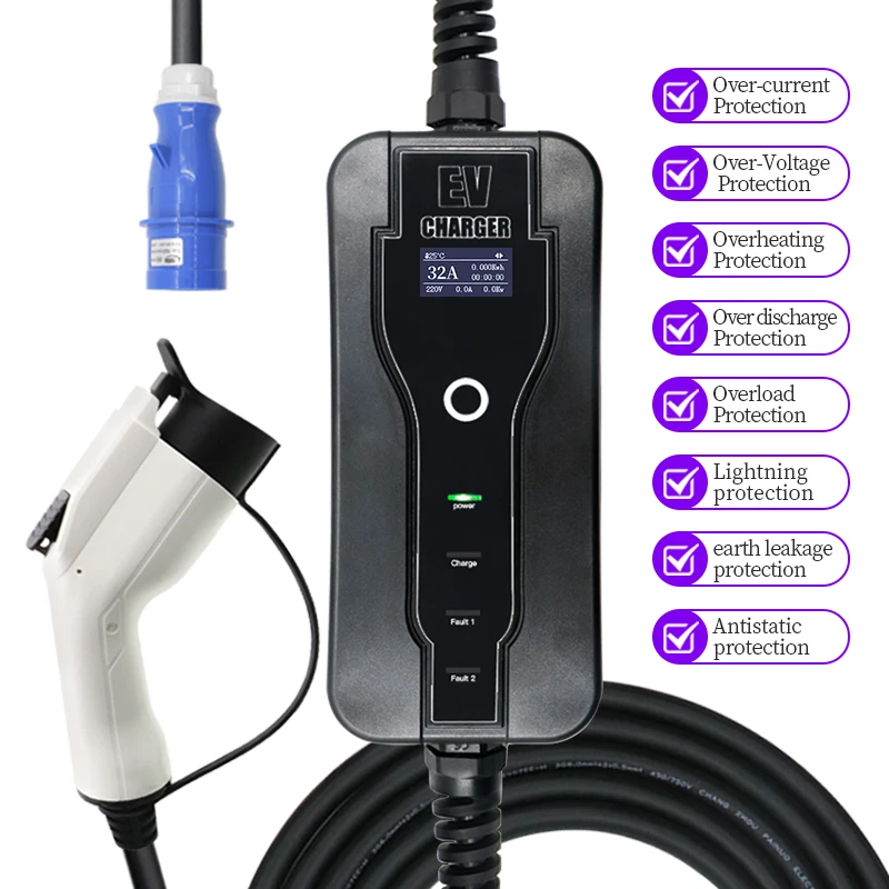 1. Разъем для зарядки: 5 контактов (соответствует стандарту SAE J1772)2. Разъем питания: синяя вилка CEE3. Длина шнура зарядного устройства: 5 м4. Номинальное Напряжение: 220/250V5. Номинальный ток: 32A6. Рабочая температура: -30 ℃ ~ + 55 ℃7. Рекомендуется использовать в помещении8. CE признанный компонент