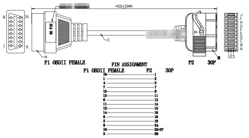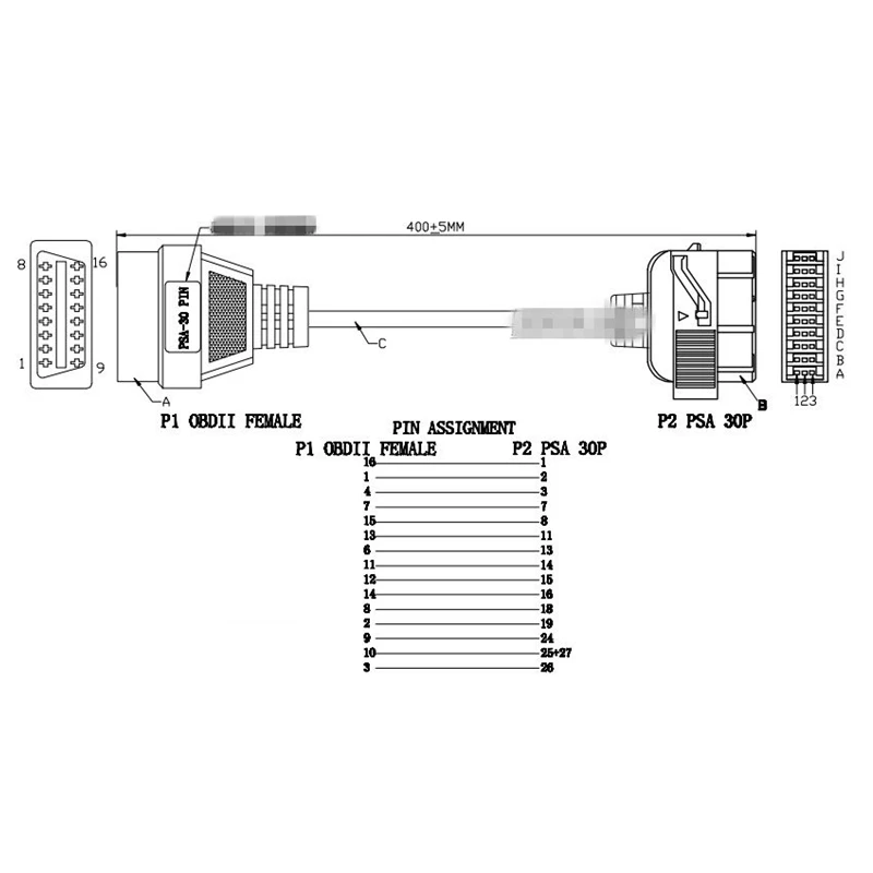 4. Кабель имеет два разъема: один-PSA для PEUGEOT, для CITROEN 30 контактный разъем, другой-16 контактный разъем OBD OBDII.