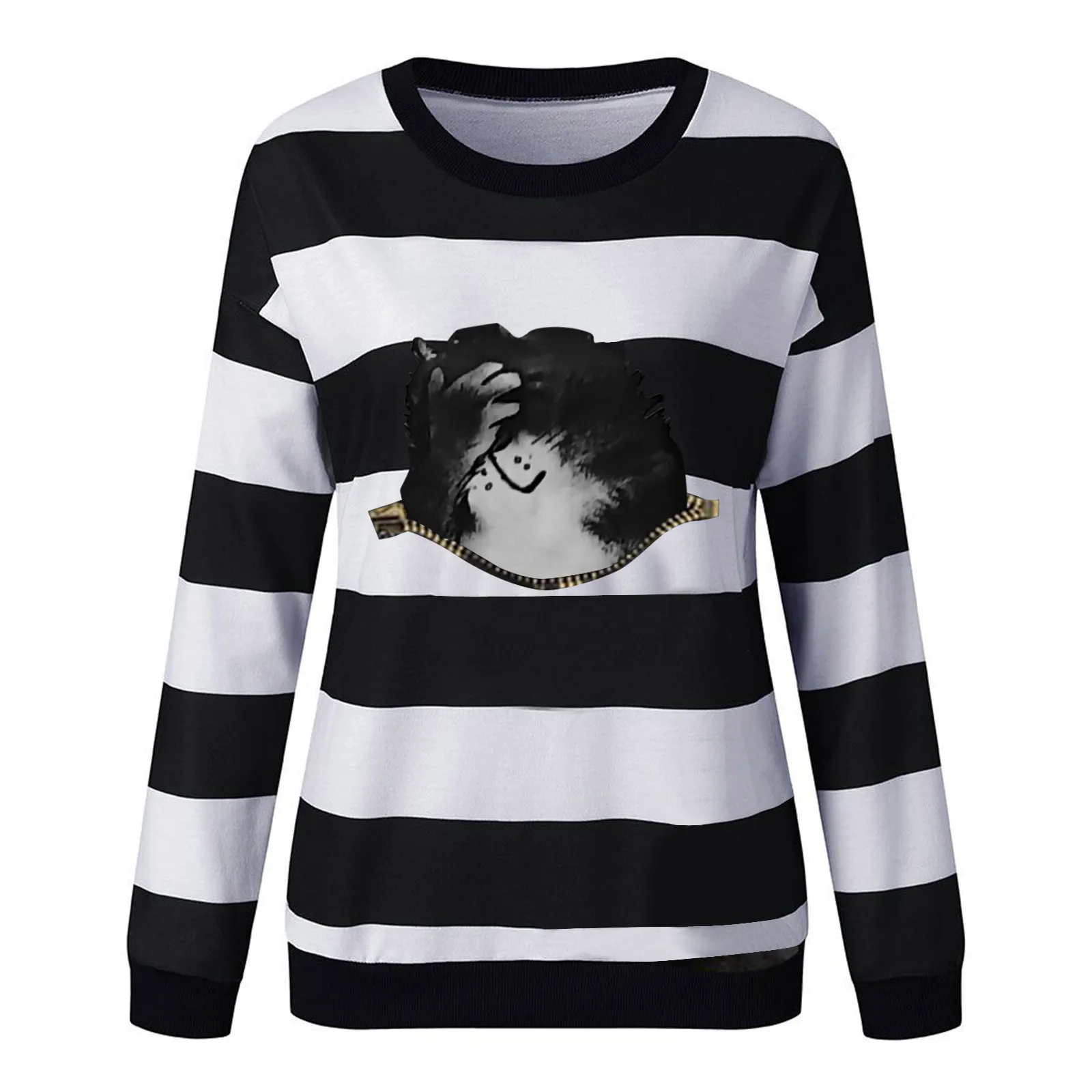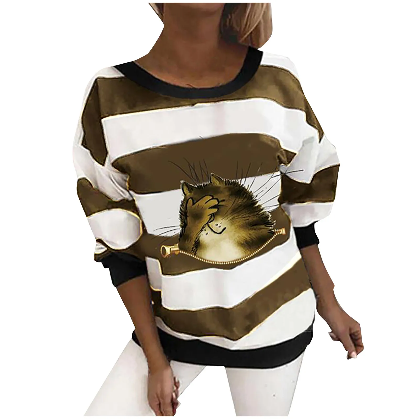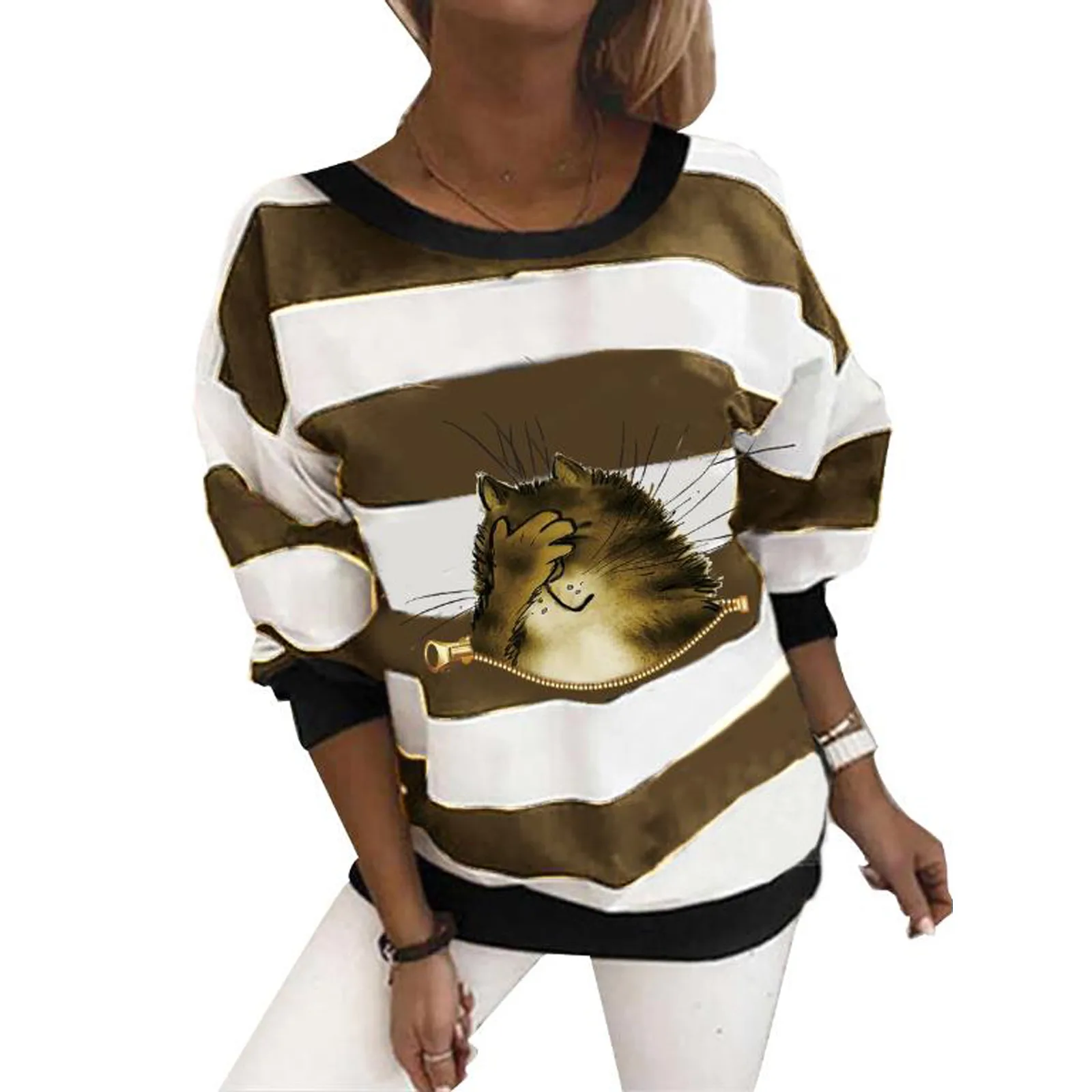 Женские зимние футболки в стиле Харадзюку, теплый пуловер с длинным рукавом и принтом животные в полоску, женские футболки