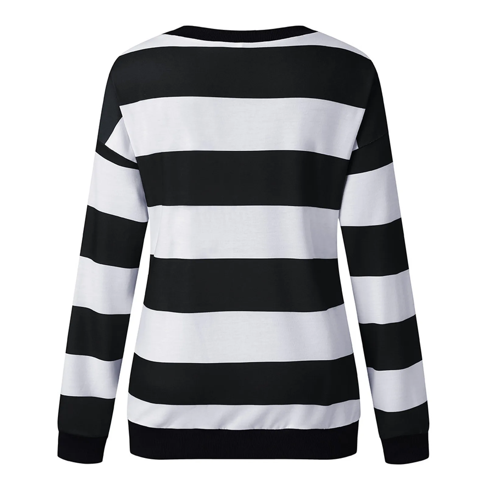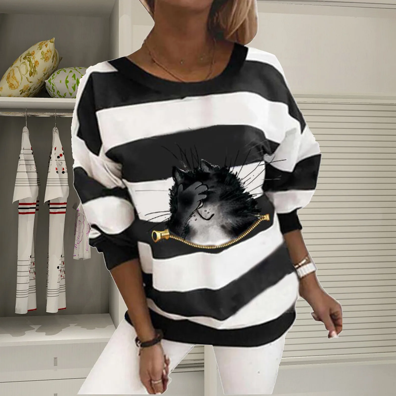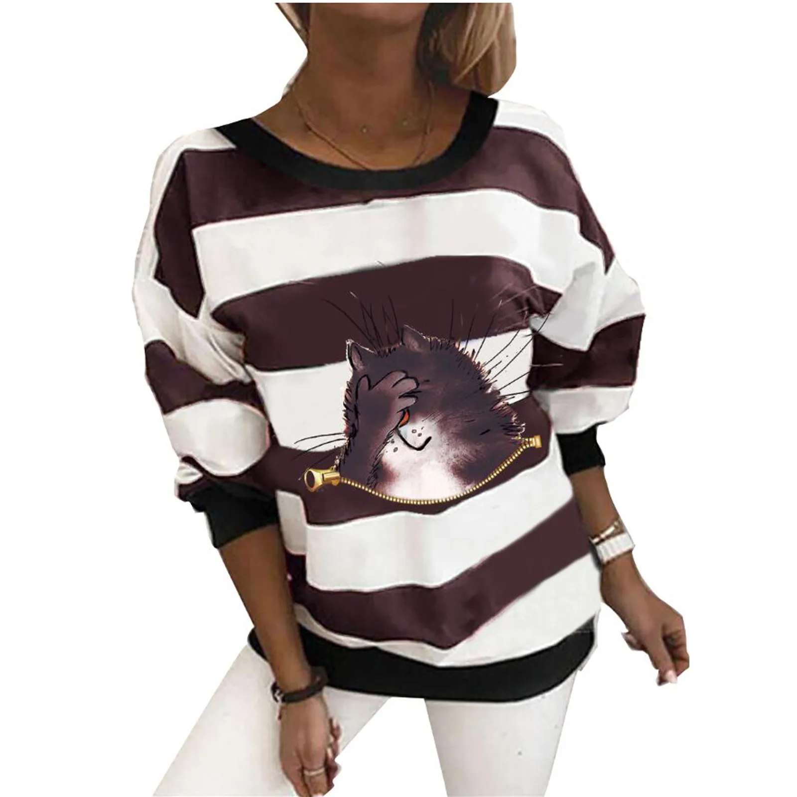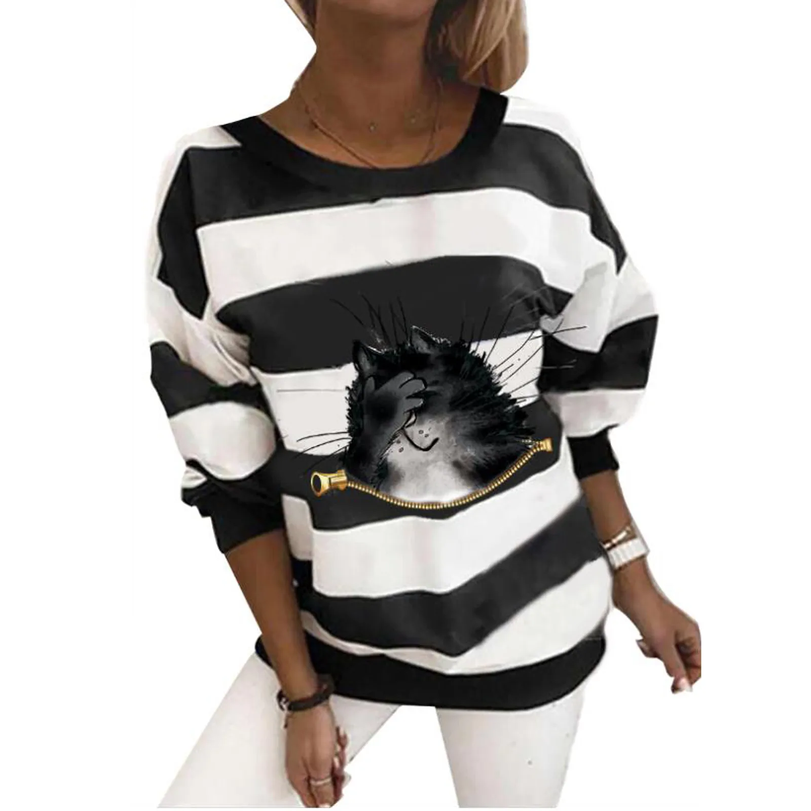 Женские зимние футболки в стиле Харадзюку, теплый пуловер с длинным рукавом и принтом животные в полоску, женские футболки