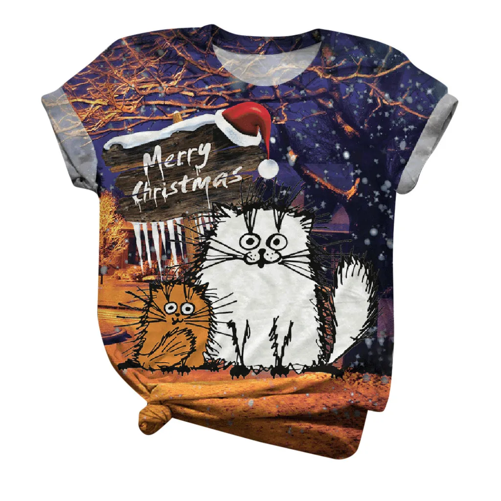 Футболка женская с коротким рукавом и круглым вырезом, Топ в стиле Харадзюку, с 3D-принтом рождественского кота, размера плюс