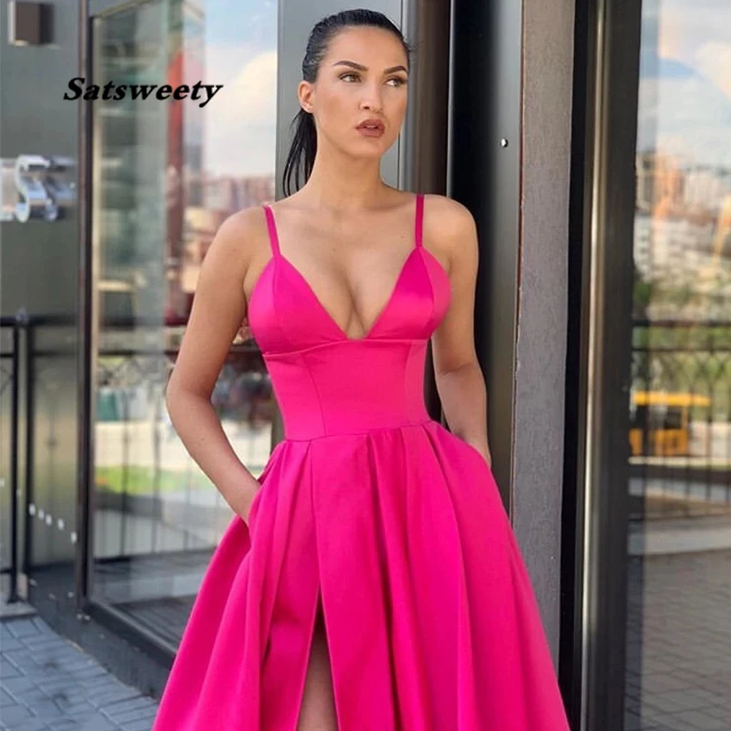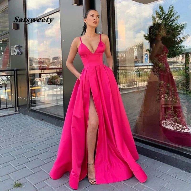 Простое длинное платье для выпускного вечера с карманами, V-образным вырезом и разрезом спереди, фуксия, атласное официальное платье, сексуальное платье на бретелях-спагетти для выпускного вечера, 2022