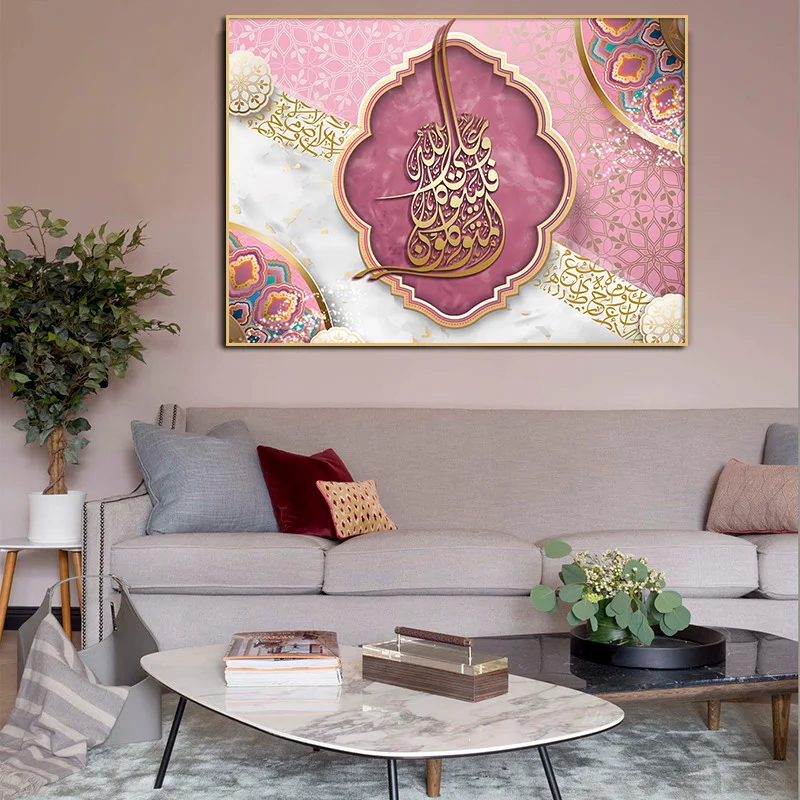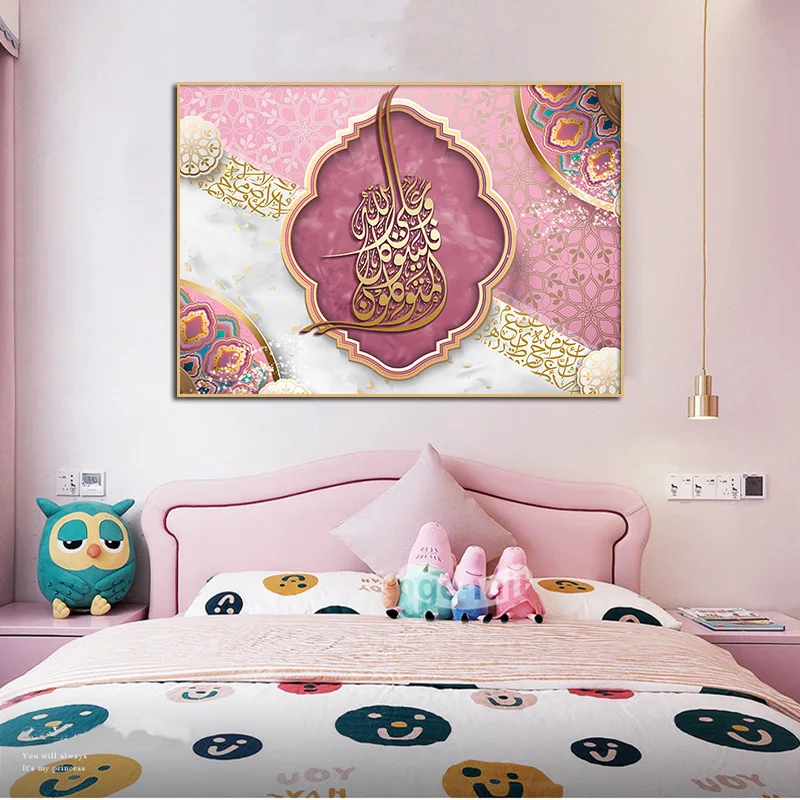 Плакат и принты, Современная Исламская каллиграфия, Коран, розовый холст, настенная живопись, религия, картина для дома, мечети, декор комнаты