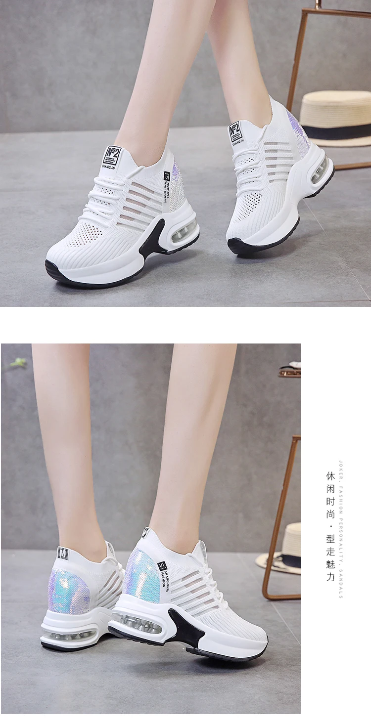 Кроссовки женские сетчатые, белые, на высоком каблуке 12 см
