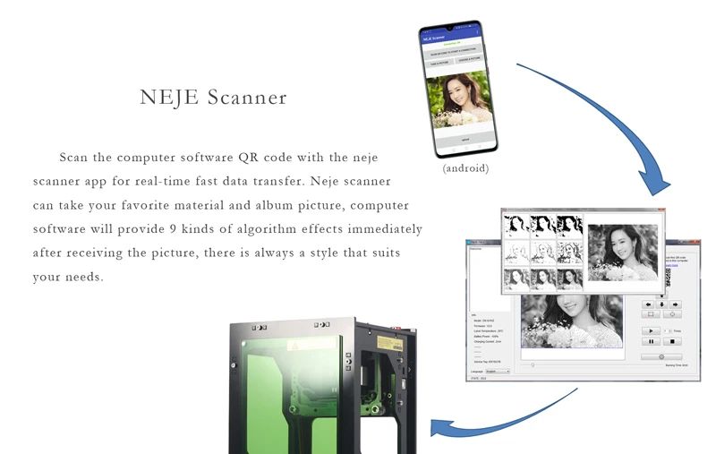 2. Поддержка приложения «neje Scanner», ручная работа, сканирование фотографий, интеллектуальный алгоритм автоматического подключения и печати.
