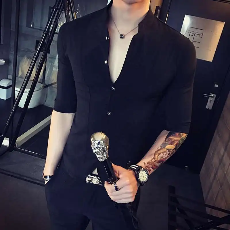 Рубашка мужская с воротником-стойкой, дизайнерская Клубная сорочка в китайском стиле, с рукавом до локтя, цвет черныйбелый, лето 2021
