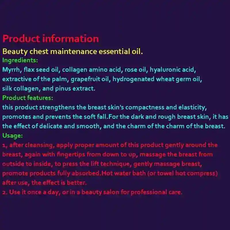 Характеристика:Обратите внимание: другие аксессуары не включены.100% новое качествоСпецификация: 30 млСырье:Льняное масло, Коллагеновые аминокислоты, розовое масло, гиалуроновая кислота, экстракт ладони, масло грейпфрута, гидрогенное масло зародышей пшеницы, Шелковый коллаген и экстракт соснового дерева.Особенности:Этот продукт повышает упругость и эластичность кожи груди, способствует и предотвращает мягкость. Для темной и грубой кожи груди, она имеет нежный и гладкий эффект, а также очарование груди.Использование:1. После очищения аккуратно нанесите нужное количество этого продукта вокруг правильного количества этого продукта. Грудь, массируйте грудь снизу и Сверху снова кончиками пальцев снаружи и изнутри. Нажмите на подъемную технику, чтобы мягко массировать грудь, чтобы повысить полное поглощение продукта. Ванна с горячей водой (или горячий компресс для полотенец) будет более эффективной после использования.2. Использовать его один раз в день, или выполнять профессиональную заботу в салоне красоты.Примечание: Если вы обнаружите дискомфорт кожи, пожалуйста, прекратите использовать его.Срок годности: 3 годаКомментарий:1. Погрешность измерения вручную составляет 2-5g. Пожалуйста, не обращайте внимания на вашу замену.2. Из-за различий между различными мониторами изображение может не отражать фактический цвет изделия. Большое спасибо!3. Цвет SKU-это цвет упаковки продуктаПосылка включает в себя:1 * эфирное масло для ухода за грудью