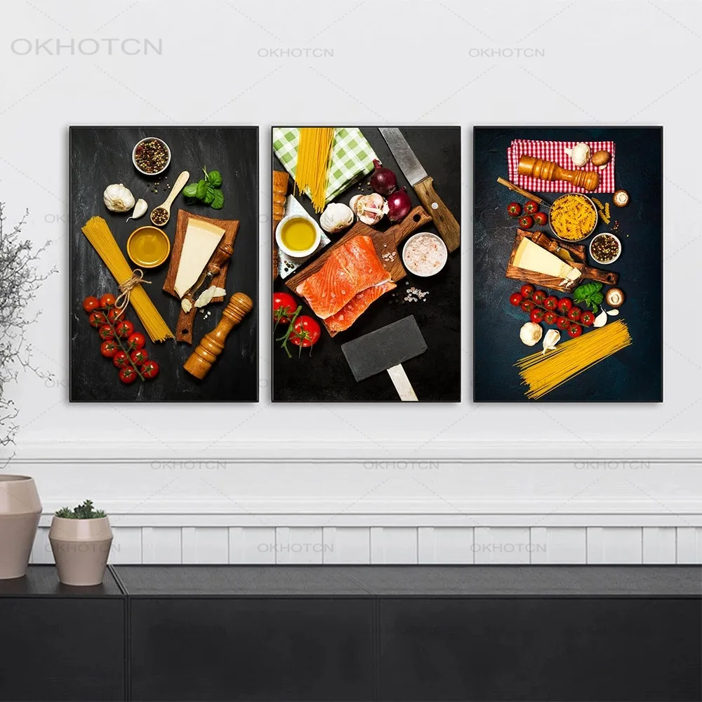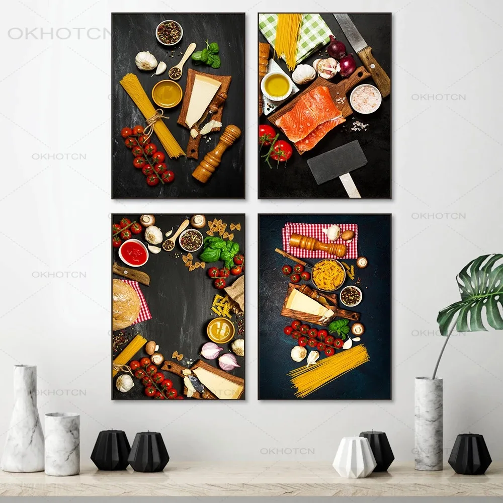 Печать сырой макароны с помидорами и сыром и постер для пиццы с мясом, едой, холст для рисования, картины, настенное искусство для декора кухни