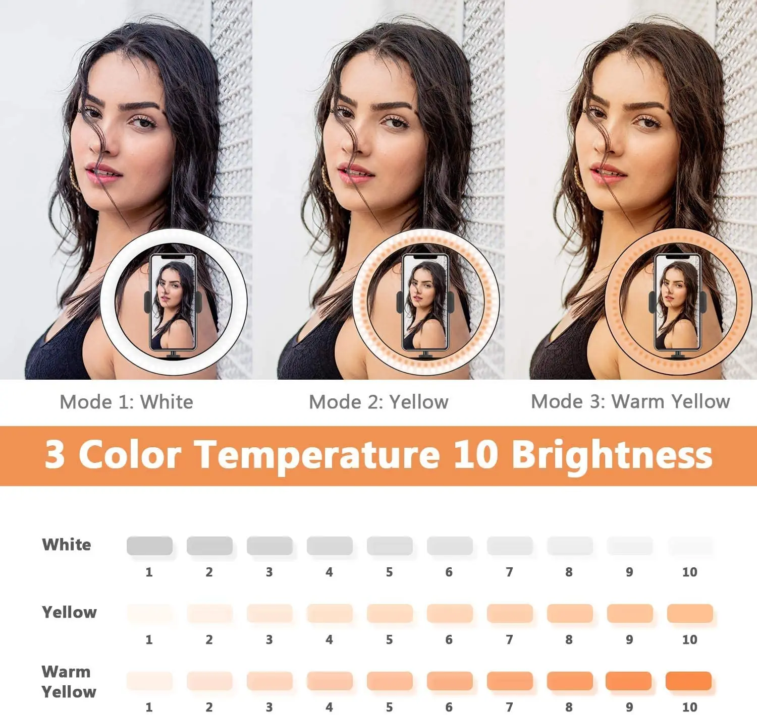 Детали кольцесветильник льника: Потокосветильник светодиодный поток Три режима освещения (белый, теплый белый, теплый желтый) Устойчивый Штатив с противоскользящими ножками 10 уровней яркости освещения Универсальный держатель для телефона (от 2,36 до 3,35 дюйма в ширину) Регулируемая высота подставки (от 14 до 47 дюймов) Быстрая и простая сборка, разборка Характеристики штатива: Модель: WT3130 Материал: алюминиевый сплав Длина в сложенном виде: 42 см/16,2 дюйма Максимальная высота штатива: 125 см Количество колонок: 4 секции Грузоподъемность: 2,5 кг/фунта Вес изделия: 522 г/фунта Посылка: 9*9*43 см/3,5*3,5 * 16.9in Вес посылка: 640 г/1,41 фунта Пульт дистанционного управления Bluetooth: Обратите внимание, что пульт не включает батарею 1. Нажмите кнопку питания, светодиодный мигает; 2. После включения питания нажмите кнопку сопряжения bluetooth светодиодный медленно мигает. Bluetooth переходит в состояние, которое можно найти и сопоставить; 3. Используйте мобильный телефон для сопряжения. Светодиодный погаснет после успешного сопряжения; 4. Нажмите и удерживайте соответствующую клавишу конфигурации. Светодиодный светильник после настройки. В настоящее время продукт можно использовать как обычно. 5. Без использования в течение пяти минут продукт автоматически переходит в спящее состояние. Пожалуйста, нажмите кнопку питания, чтобы выключить таймер, когда он не используется, чтобы убедиться, что батарея используется для долгое время. 6. Можно заряжать с помощью ПК-устройств или мобильного адаптера питания. Светодиодный включен --- зарядка. Светодиодный --- насыщенность. Посылка: Пожалуйста, посмотрите детали изображения