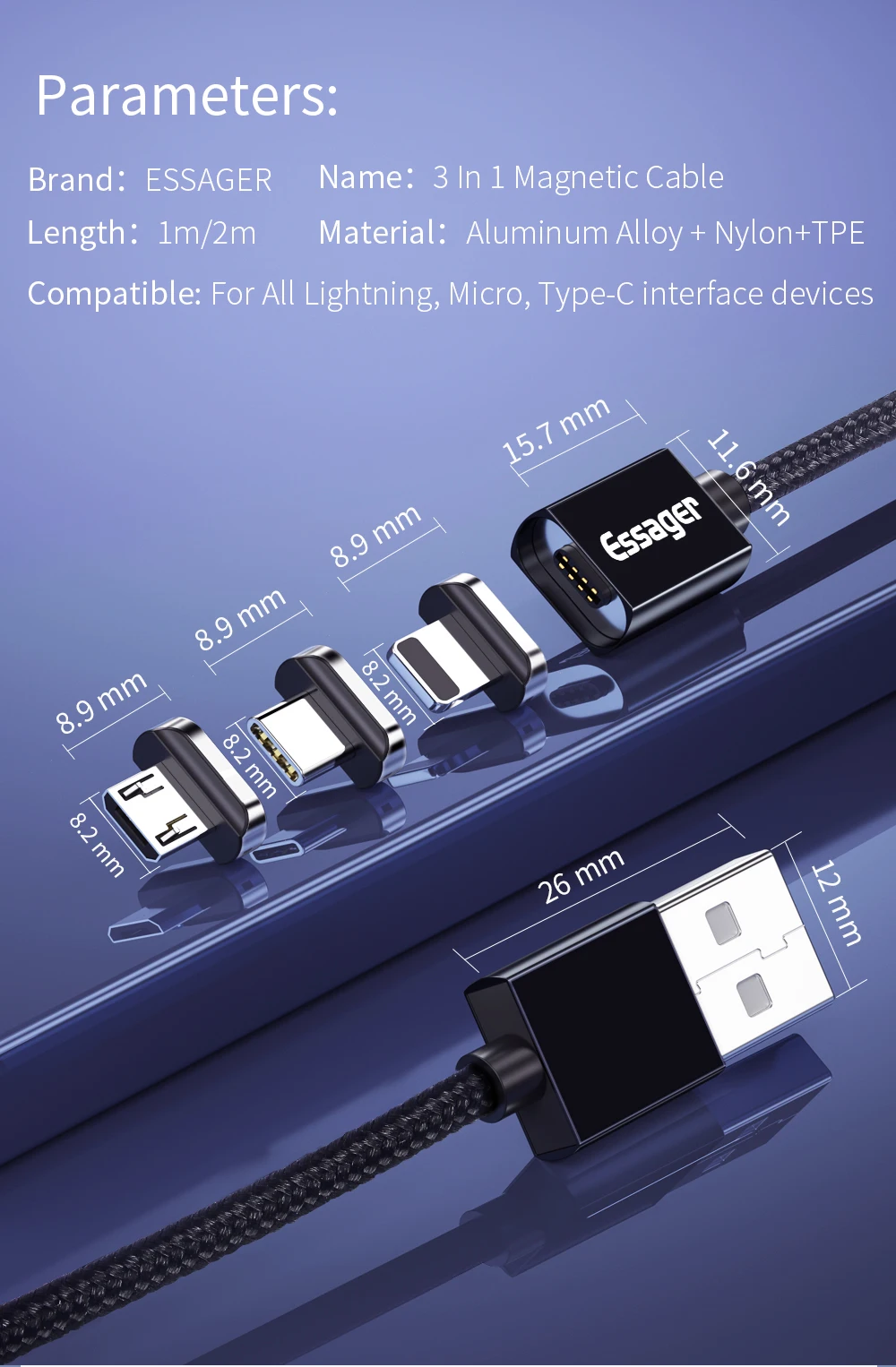 Магнитный кабель Essager Micro USB, кабель для быстрой зарядки и передачи данных, 3 А, магнитное зарядное устройство для iPhone, Samsung, Xiaomi, USB Type-C, шнур для телефона, кабель USBC