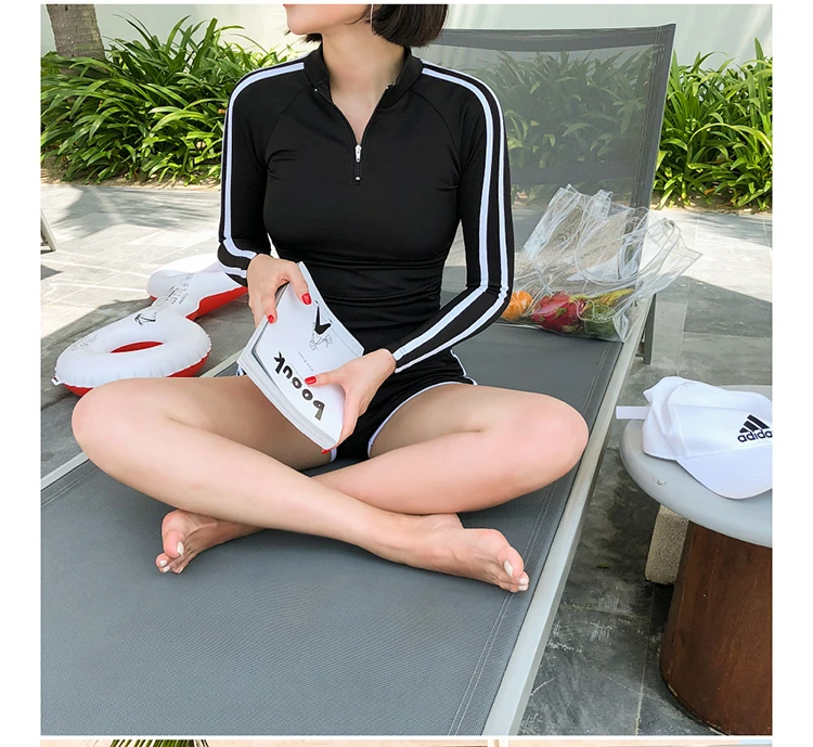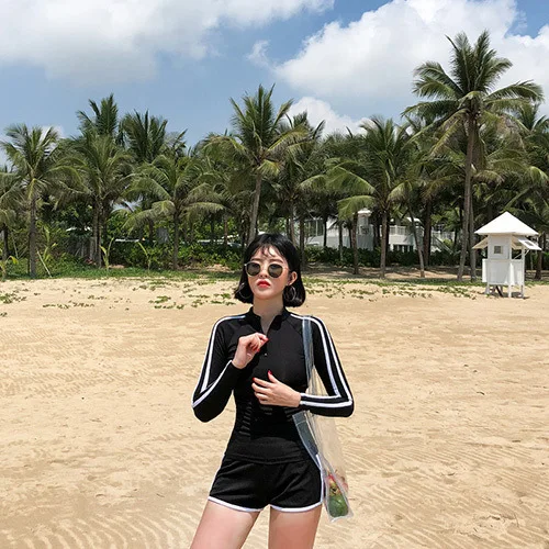 Новый женский купальник в Корейском стиле из трех предметов, боксеры с разрезом, черный облегающий спортивный купальник с длинным рукавом и защитой от солнца для живота