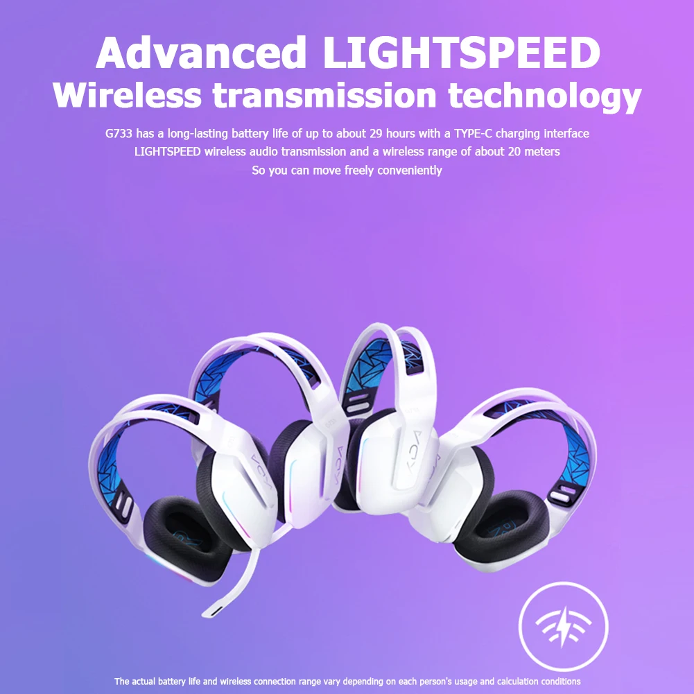 2. Передовая технология беспроводной передачи LIGHTSPEED: G733 имеет длительный срок службы батареи около 29 часов, оснащен TYPE-C зарядным интерфейсом; беспроводная передача звука LIGHTSPEED и беспроводной диапазон около 20 метров позволяют свободно перемещаться.