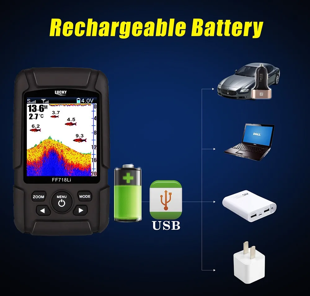 Особенности:С цветным дисплеемЭтот рыболокатор предназначен для ловли рыбы. Он может обнаруживать местоположение рыбы и размер рыбы как в пресной, так и в соленой воде и может использоваться в качестве зонда глубины.Глубина воды, температура воды, расположение рыбы, нижний контур может быть постоянно получен из водыВстроенный в память хранит гидролокатор, когда рыболокатор выключенБеспроводной датчик может выключиться, когда он выходит из водыПлавучий и водонепроницаемый гидролокатор.Описание:Портативный рыболокатор глубина водонепроницаемый рыболокаторГлубина воды, температура воды, расположение рыбы, нижний контур может быть постоянно получен из водыПользовательский выбор чувствительности, Зума, единиц измерения, дальность глубины, неглубокая сигнализация, значок рыбы, сигнализация рыбы и настройка скорости диаграммыСпецификация:Модель: FF718LiC-WМатериал: АБС-пластикЦвет: желтый и черныйТип: ЕС, Великобритания, СШАРазмер основного продукта: 125*70 ммРазмер датчика гидролокатора: 70*70 ммРазмер посылка: 14,7*8*9,5 смРыболокатор:Дисплей: 2,8 дюймовый цветной TFT ЖК-дисплей 240 × 320 (RGB)Подсветка: Вкл/Выкл Белый светодиодныйВарианты языка: английский/русскийРабочая температура: -14-122 °F (-10-50 °C)Мощность: 1*3,7 V перезаряжаемая литиевая батарея (все указанные аккумуляторы входят в комплект поставки)Напряжение зарядного устройства: 5 В 500 мАВремя работы: 10 часовДатчик гидролокатораУгол луча: 90 °Глубина Диапазон: 0,7-для использования на глубине до 45 м/2-145ftРабочая частота: 125 кГцРабочий диапазон: 200 мБеспроводная Частота: 433,92 МГцТребования к питанию: 1 * CR2032 (в комплекте)Время работы: 40 часовПосылка включает в себя:1 * рыболокатор1 * Беспроводной датчик гидролокатора1 * зарядное устройство1 * Автомобильное зарядное устройство1 * зарядный кабель1 * шейный ремешок1 * Руководство пользователя