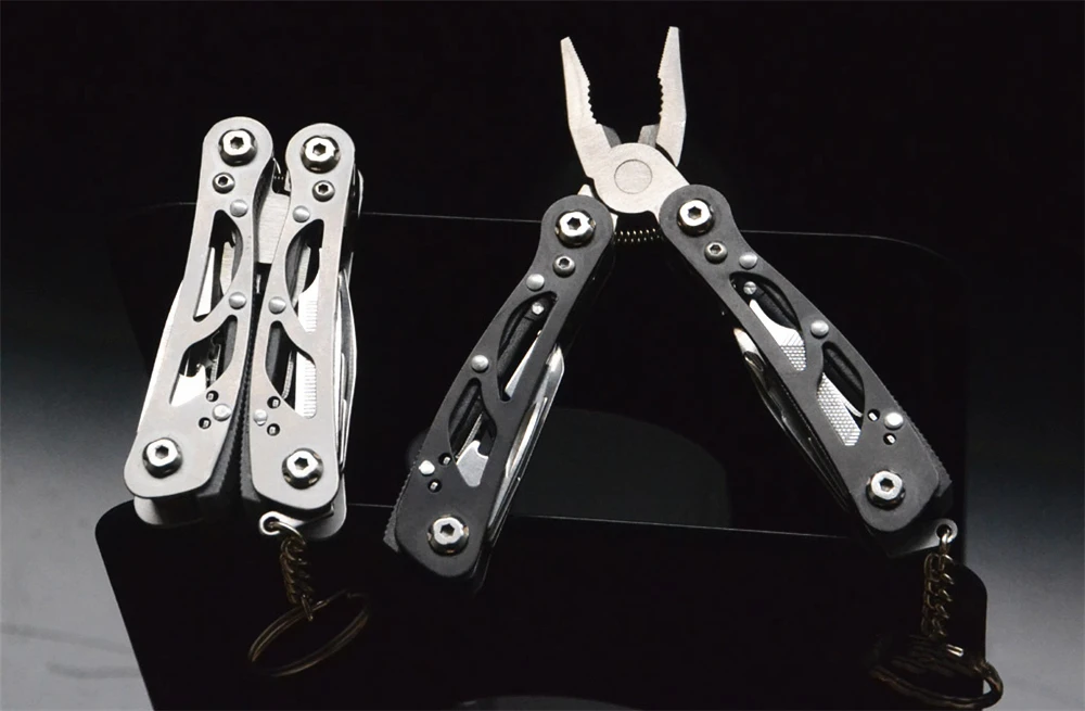 1. Многофункциональные инструменты-плоскогубцы, резак, полупила, острый скребок, маленькая отвертка, открывалка для бутылок, большая отвертка, нож, Шлицевая отвертка, серповидный, осушитель, кольцо для ключей.
