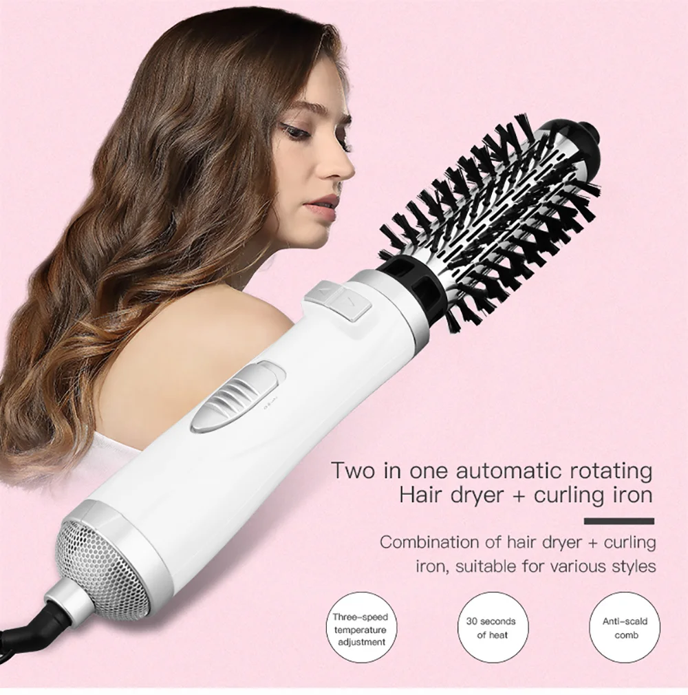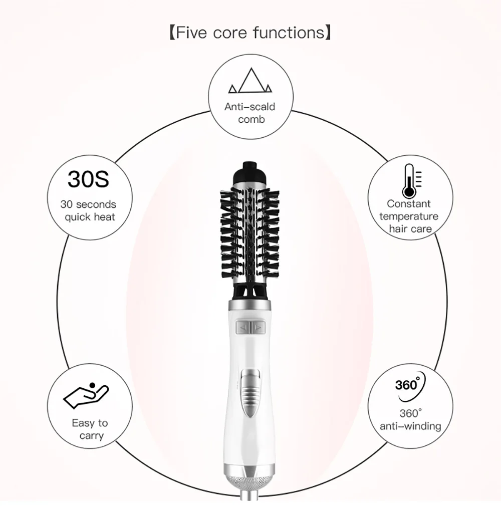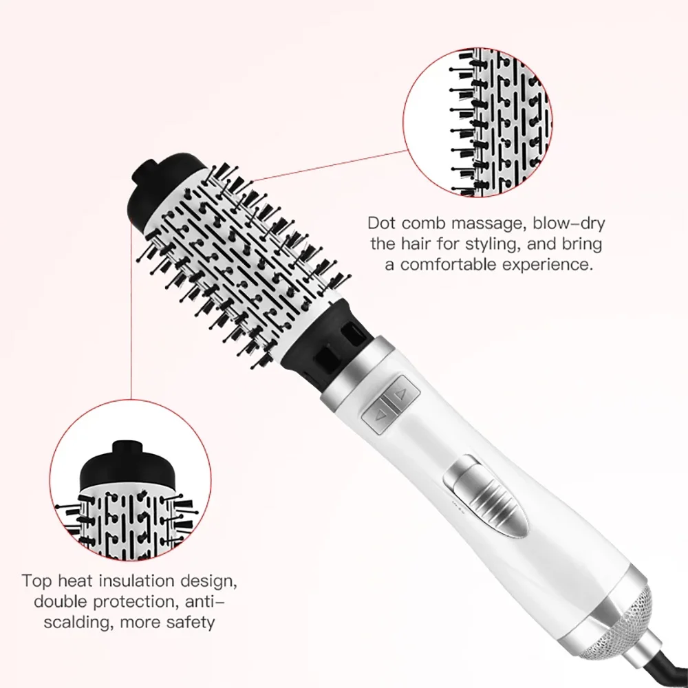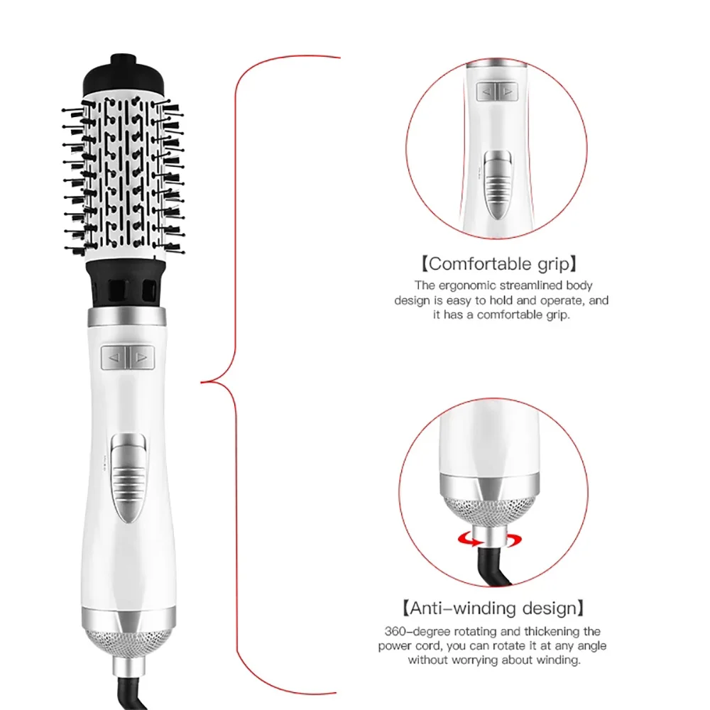7. Две сменные электрические щетки и номинальная мощность 1000 Вт позволяют быстро высушить волосы, легко укладывая волосы.