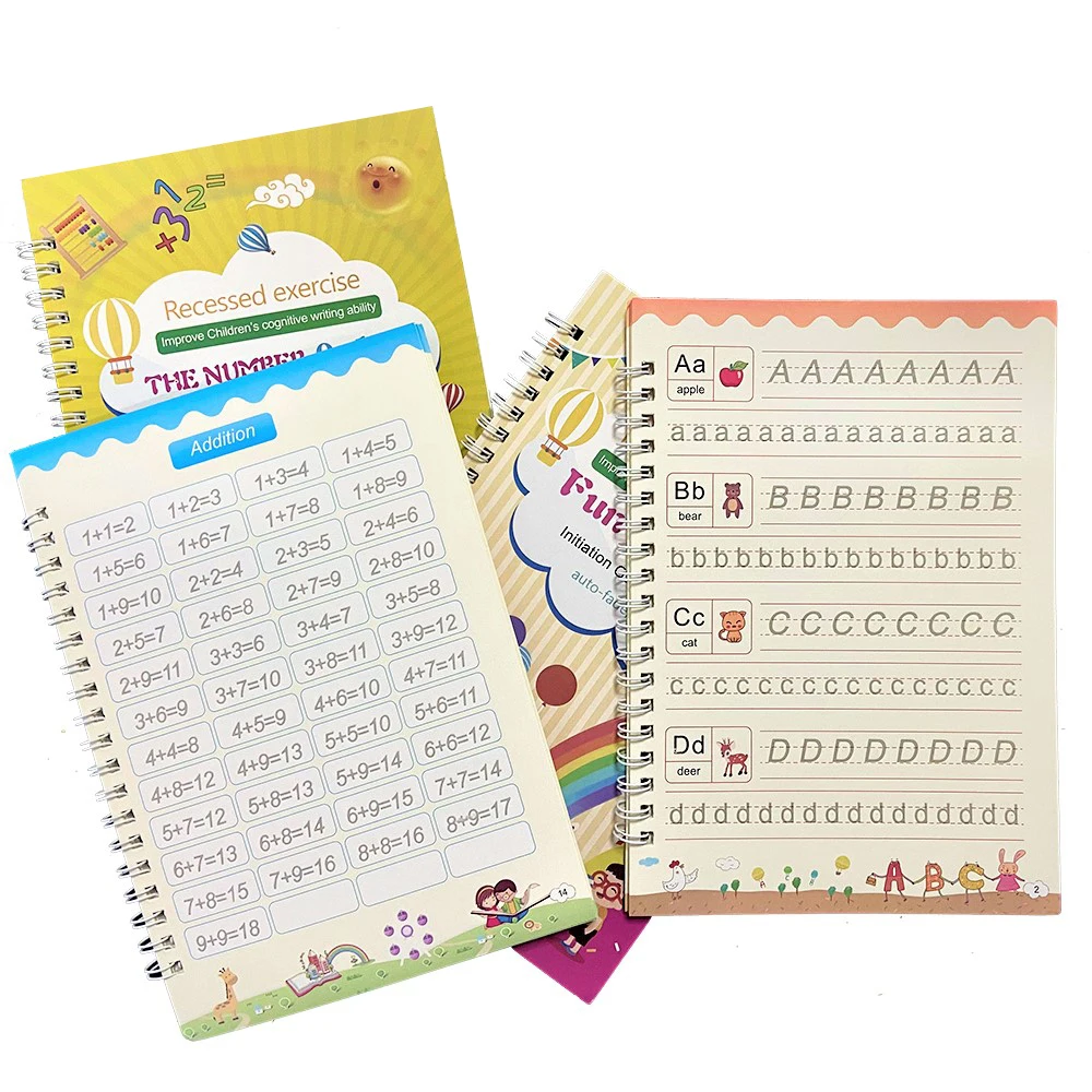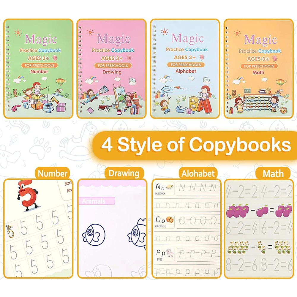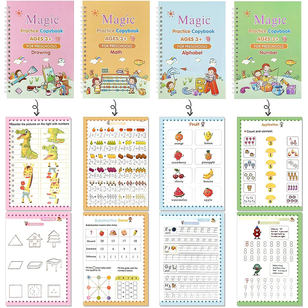 4 книги + ручка, волшебная практическая книга, Бесплатная вытирание, детская игрушка, стикер для письма, английская книга для каллиграфии, Монтессори, игрушки