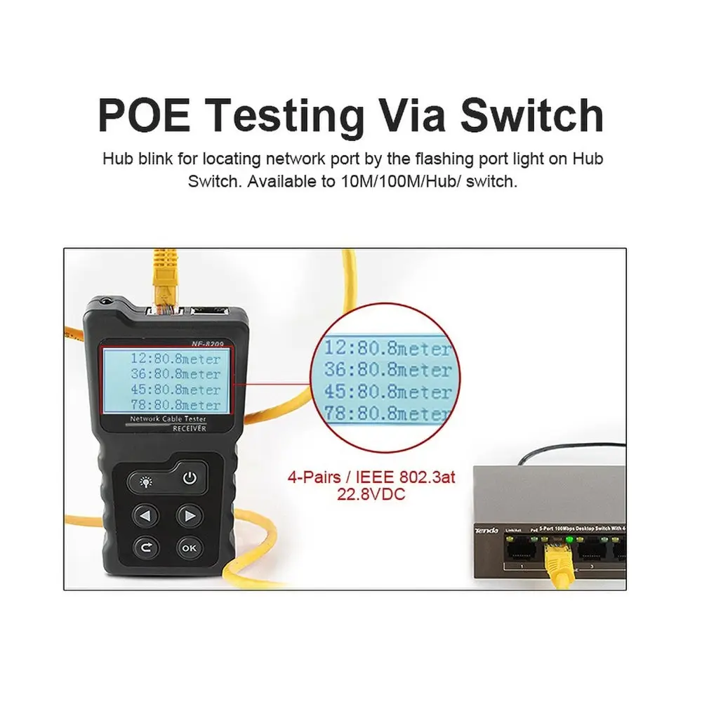 Продукт включает измерение длины кабеля, тестирование неисправности кабеля, тестирование PoE, мигание концентратора и функцию NCV, все это делает его незаменимым инструментом для инженеров-кабельщиков.