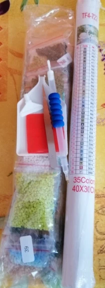 Холст прибыл в неповрежденном пузырьковом конверте. Холст обернут вокруг пенопластовой трубки и ламинирован, бриллианты находятся в отдельных маленьких пакетах с избытком. Everything is complete. Продавец рекомендует, потому что Доставка за 10 дней
