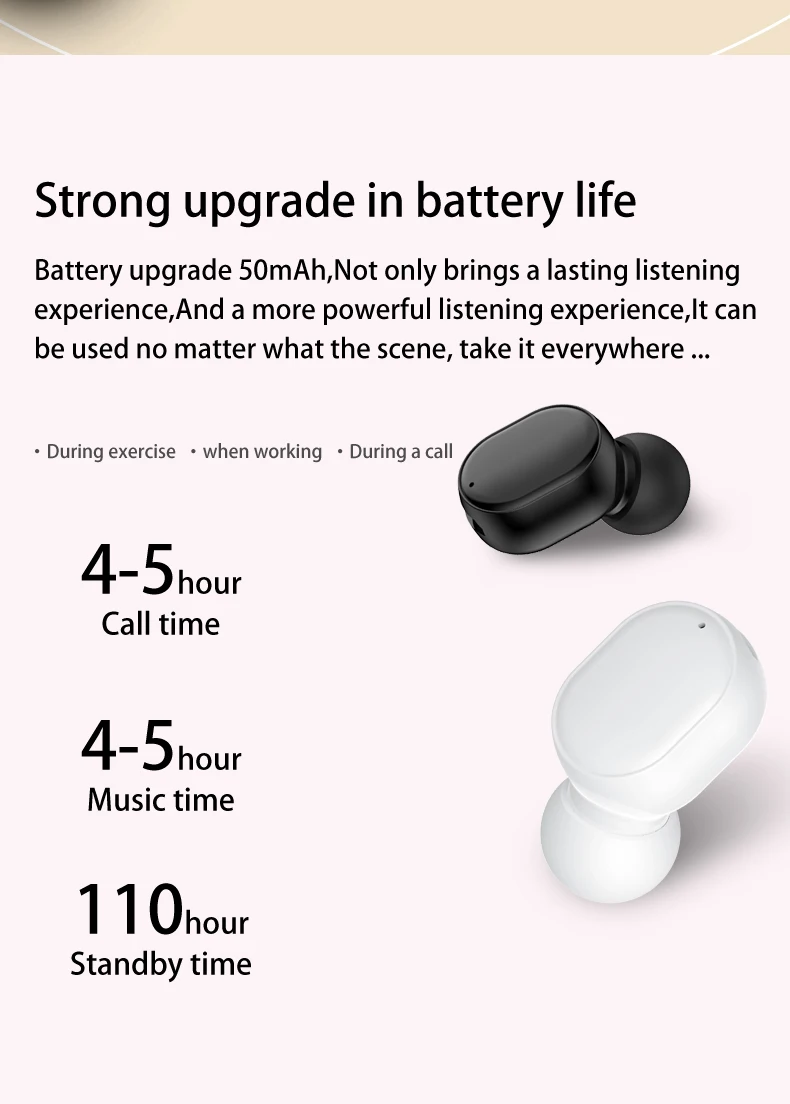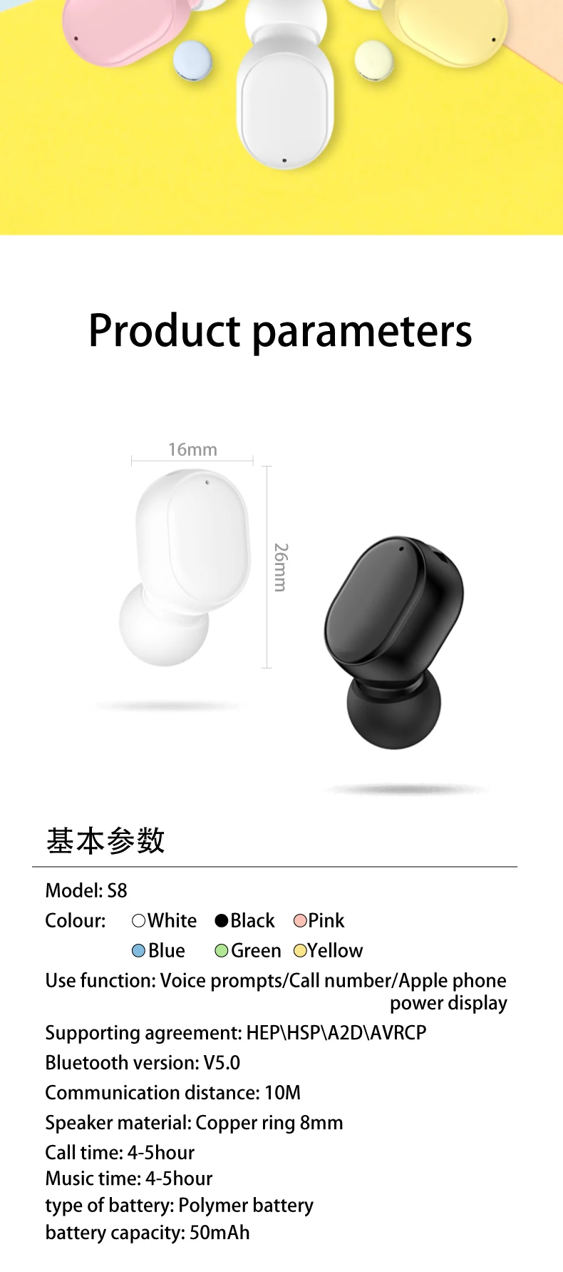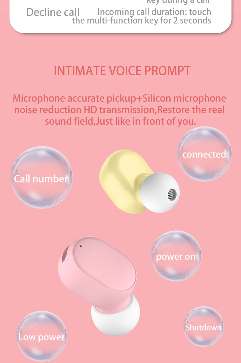 Характеристики: • миниатюрный беспроводной невидимый дизайн в ушах; • супер мини-размер и скрытый в ушах, без нагрузки на ношение; • эргономичный дизайн наушников, стабильный в ушах, хорошо подходит для вождения, занятий спортом, деловой встречи или отдыха; • Повторное соединение через Bluetooth V5.0 + EDR беспроводной сигнал с 10-метрового диапазона. • Глубокий микрофон с шумоподавлением DPS обеспечивает четкое качество вызова; • голосовые подсказки для сопряжения, вызова, включения/выключения; • Одна функциональная кнопка для включения/выключения, переключатель песни, изменение языка, получите звонок. Спецификация: версия Bluetooth: Bluetooth V5.0 расстояние Bluetooth: около 10 м Время работы: около 4-5 часов Время зарядки: около 1-2 часов батарея capcity:50 мА · ч Совместимый телефон: совместимость с Android, iOS, Microsoft, Tablet, 99% телефона с bluetooth. Посылка: 1 * наушники (только 1 шт.) 1 * USB кабель для зарядного устройства 1 * Руководство пользователя