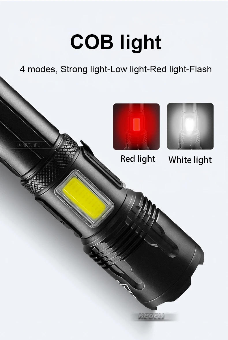 Товары имеют 7 позиций, 3 шестерни XHP110 светодиодный + 4 шестерни COBНажмите на выключатель напрямую: 100%-50%-SOS (трехскоростной режим)Двойной щелчок для открытия режима COB: белый светильник 100%-белый светильник 50%-красный светильник 100%-красный светильник SOS