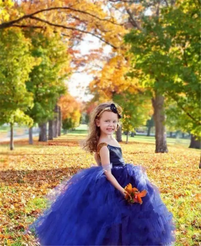 Темно-синее Тюлевое платье бальное платье для девочек в цветочек, платья для свадьбы с открытым плечом и пышной многослойной юбкой; Нарядное кружевное платье длиной до пола Длина Детские вечерние платья