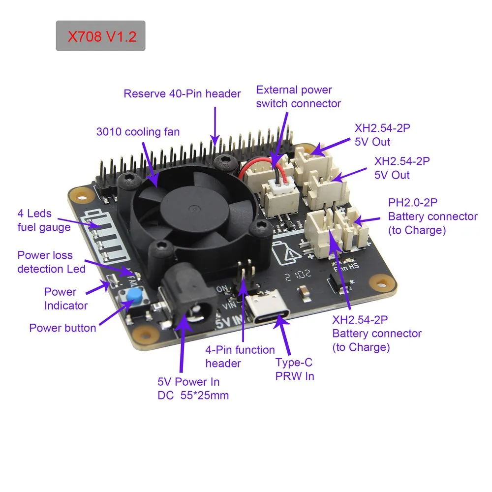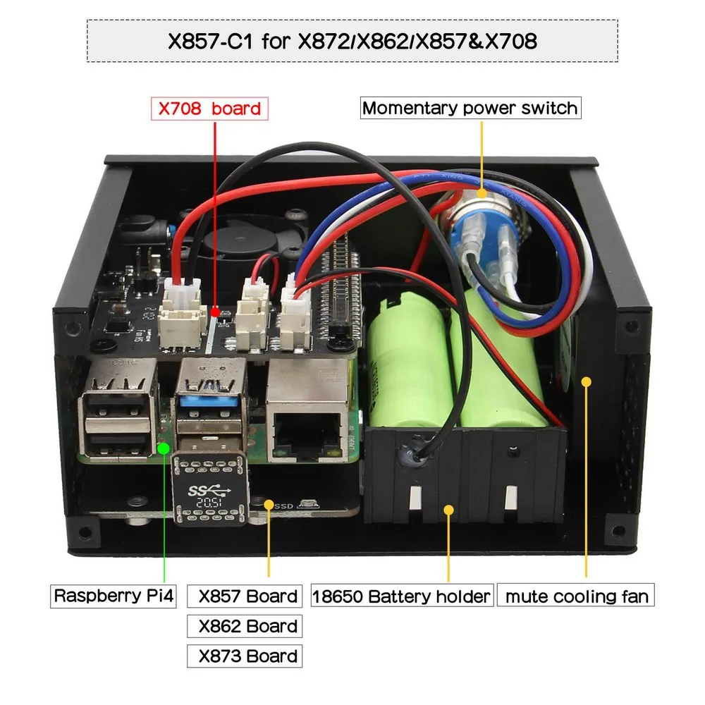 Примечание: в комплект не входит Raspberry Pi 4 ,X857-C3 металлический чехол, аккумуляторы 18650.