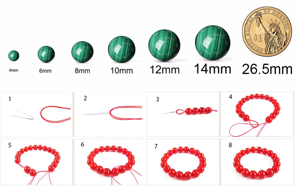 4 мм имеют бусины от 85 до 95 шт. 6 мм есть от 60 до 63 шт Бусины 8 мм имеют от 45 до 47 шт Бусины 10 мм есть от 36 до 38 шт Бусины 12 мм есть от 31 до 32 шт Бусины 14 мм есть 27-28 шт Бусины Длина: 15 дюймов (38 см) одна нить