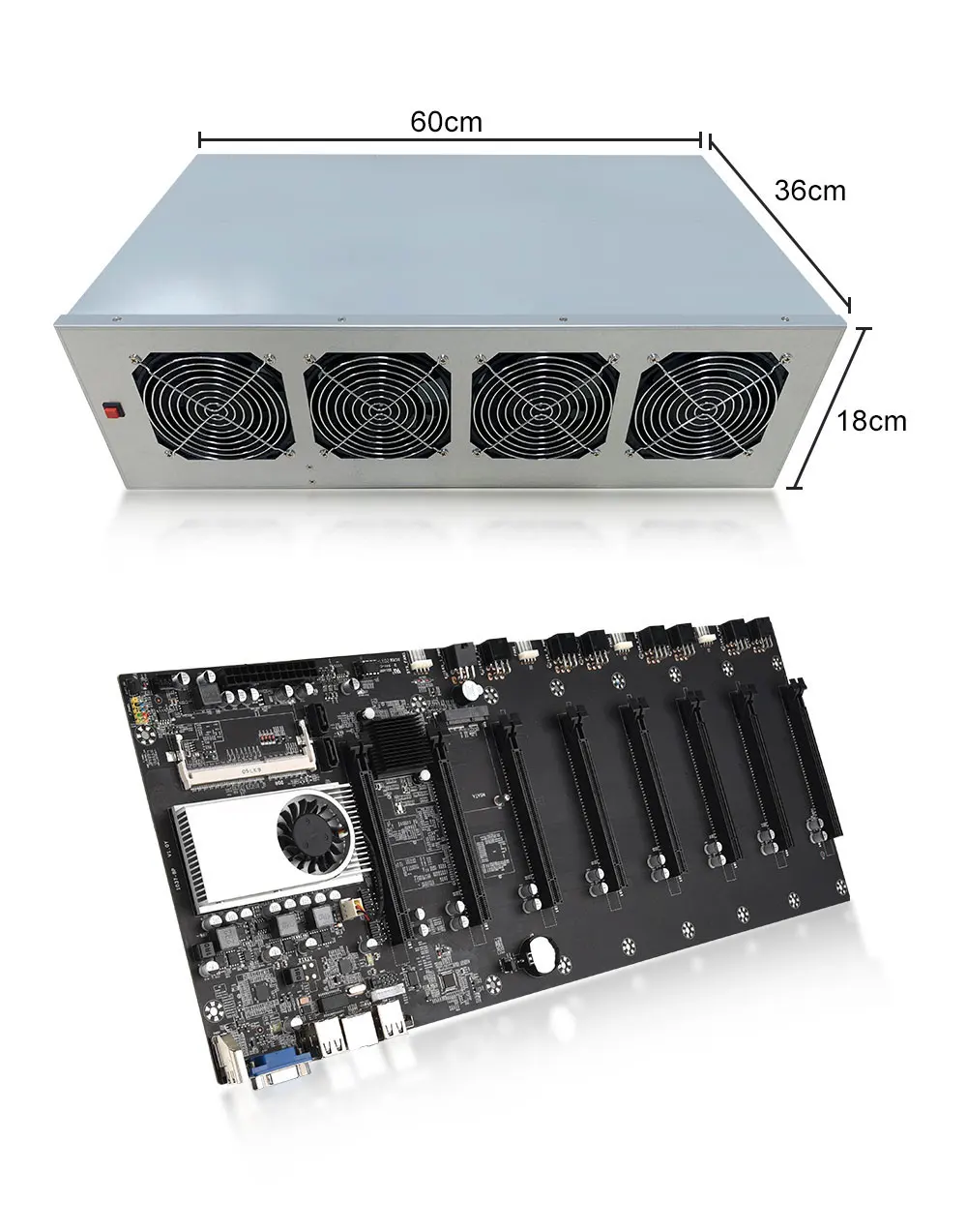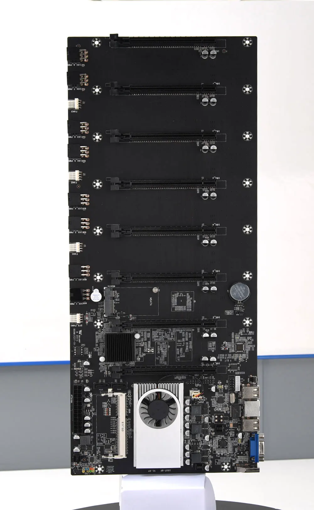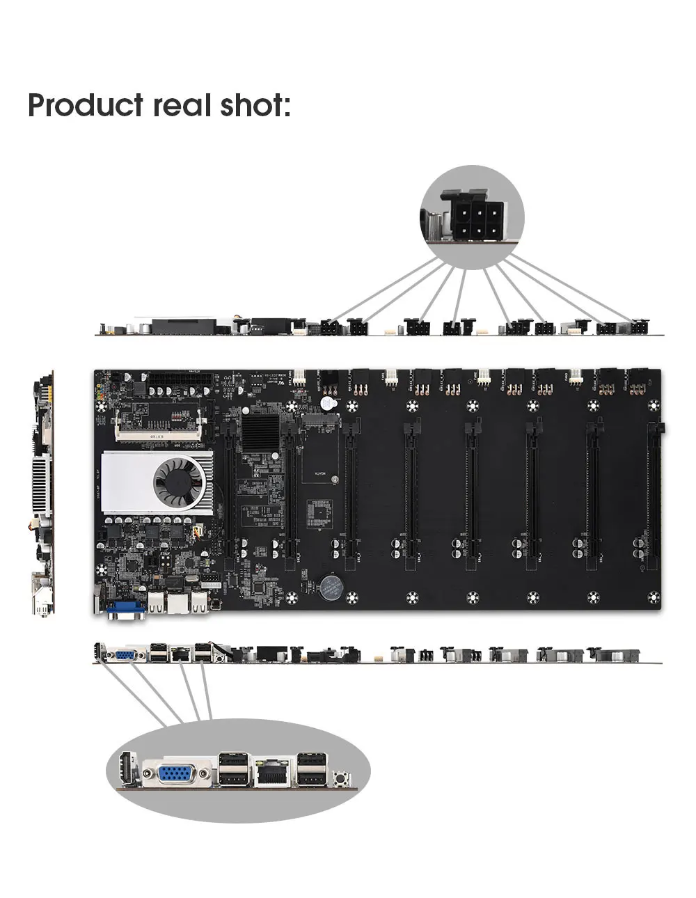 Характеристика:1. Слот для памяти: 8 графических карт, включая HDMI совместимый + VGA + 2 * sata + msata 2,0 + 8 * pcie 16x.2. Прочный: Эта материнская плата для майнинга действительно специально для вас, с долгим сроком службы и практичностью.3. Стабилизация напряжения: конденсатор стабилизации напряжения может обеспечить стабильное напряжение для вашего силового оборудования.4. Низкое энергопотребление: оно может обеспечить низкое энергопотребление, меньшее тепловыделение, энергосбережение и безопасное использование.5. Тихая Производительность: материнская плата mining machine не имеет шума во время рабочего процесса и всегда держит молчание.Описание:Этот продукт представляет собой набор ЦП для материнской платы горнодобывающей машины с низким энергопотреблением, меньшим количеством тепла, энергосбережением и энергосбережением, безопасным в использованииПроцессор: встроенная IntelCeleron⊙ cPU847 @ 180 ГГцЧип: nte③ чип HM65Бортовой VGA + HDM + PCEX16Дисплей: (для дискретной видеокарты)Память: 1 * DDR3 SODIMM слот, поддержка 1066/13331600 МГцСеть: Встроенный 1 * Realtek RTL8111F чипсет для гигабитной сети(Поддержка сетевой загрузки или PXE загрузки)Хранение: 1 * SATA3.0 + 1 * SATA2.0 + 1 * mSATA30USB: 8USB20Расширяемый порт: 8PcE16X (скорость PCEx1GEN2)1 mSATA30 интерфейс жесткого дискаБлок питания: блок питания DC12 miner (6PN "8)Размер: 55,4 мм 19,5 ммСписок:1 * материнская плата горнодобывающая машина