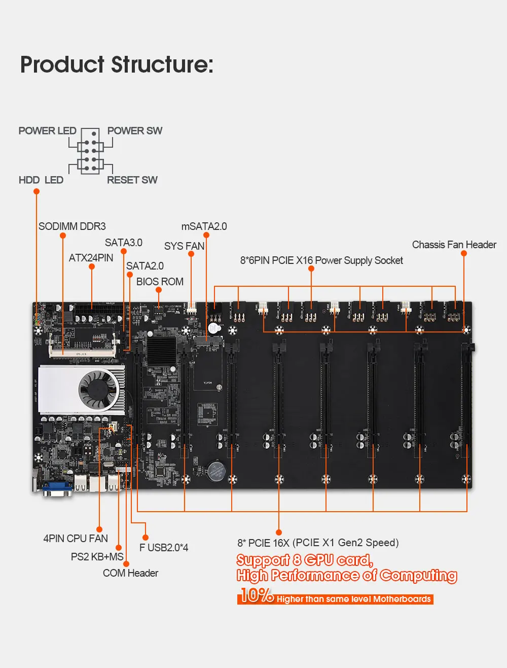 Описание:Эта материнская плата mining имеет 8 слотов для подключения GPU. Эта материнская плата является идеальным выбором для майнинга.Эта материнская плата DDR3 mining разработана с конденсаторами, которые могут стабилизировать напряжение, поэтому устройства могут быть стабильными.Эта материнская плата 8 PCI-E имеет порт, совместимый с HDMI, порт VGA, порт RJ45, порт SATA, порт USB 2,0, он может удовлетворить ваши различные потребности.Эта материнская плата SATA 3,0 является энергосберегающей и практичной в использовании. Это низкое энергопотребление, низкий уровень шума и не будет сильно нагреваться.Эта материнская плата является прочной и долговечной. Вы можете использовать его для замены поврежденной материнской платы.Характеристики:Размер: 575x195мм.Память: 1x SODIMM DDR3.Порт хранения: 1x SATA 3,0, 1x SATA 2,0, 1X mSATA 2,0.Usb-порт: 4x USB 2,0.GPU порт: 8x PCI-E 16x.Примечание:Из–за разных компьютерных разрешений может быть небольшое цветовое искажение.Возможны незначительные погрешности из-за различных ручных измерений.Посылка включает в себя:1х материнская плата.