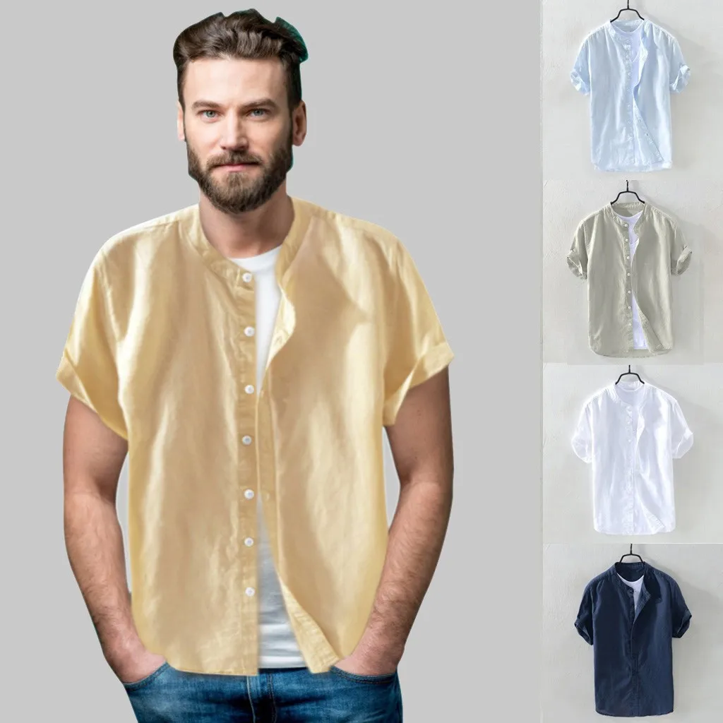 Рубашка мужская хлопково-льняная с короткими рукавами, мешковатая блузка на пуговицах в стиле Харадзюку, винтажная Ретро, с воротником-стоечкой, однотонная, на лето