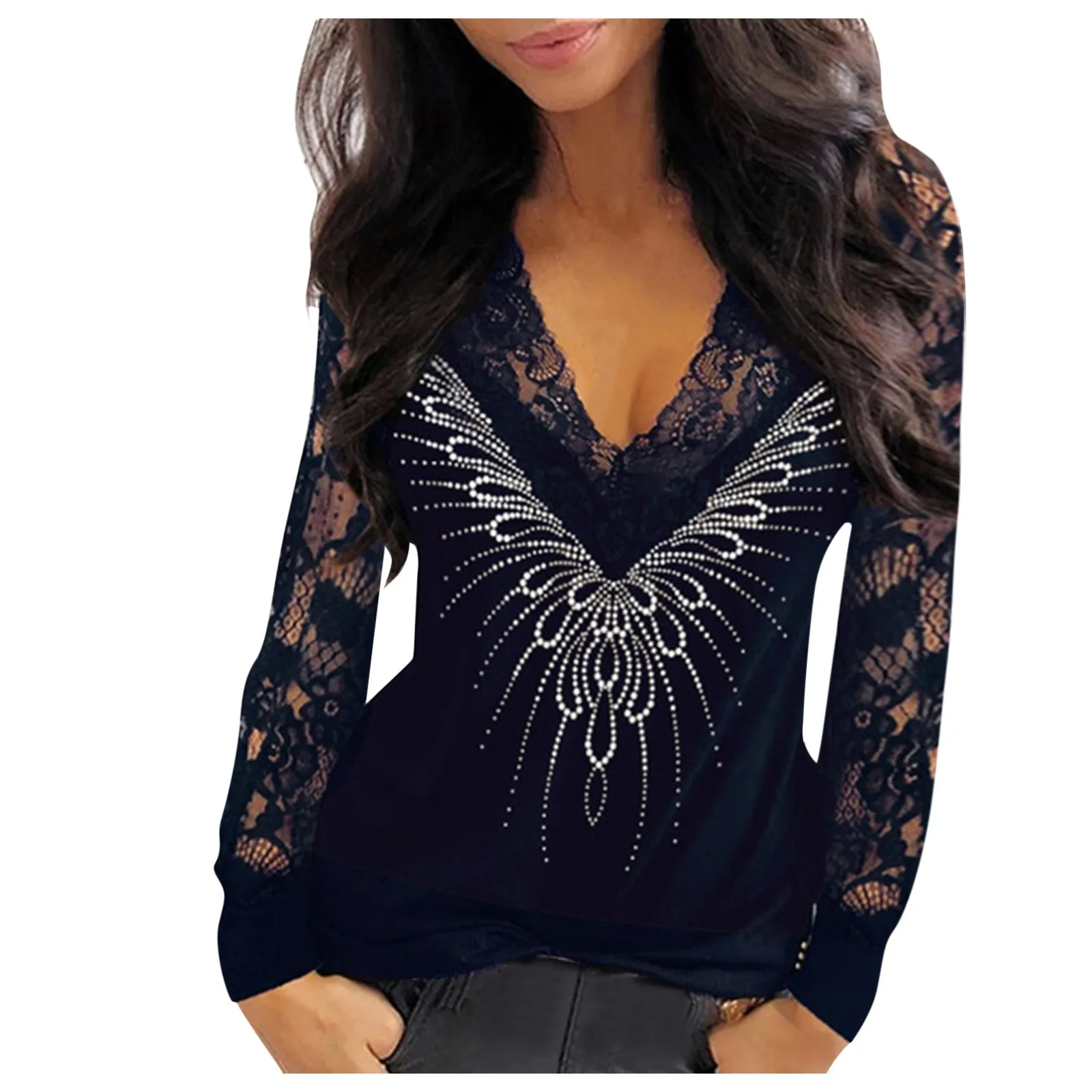 Сезон: весна-лето Черная кружевная блузка-топ Женская Повседневная с длинным рукавом стразы Bling блузки для вечерние Повседневный свитер с треугольным вырезом Топы туники
