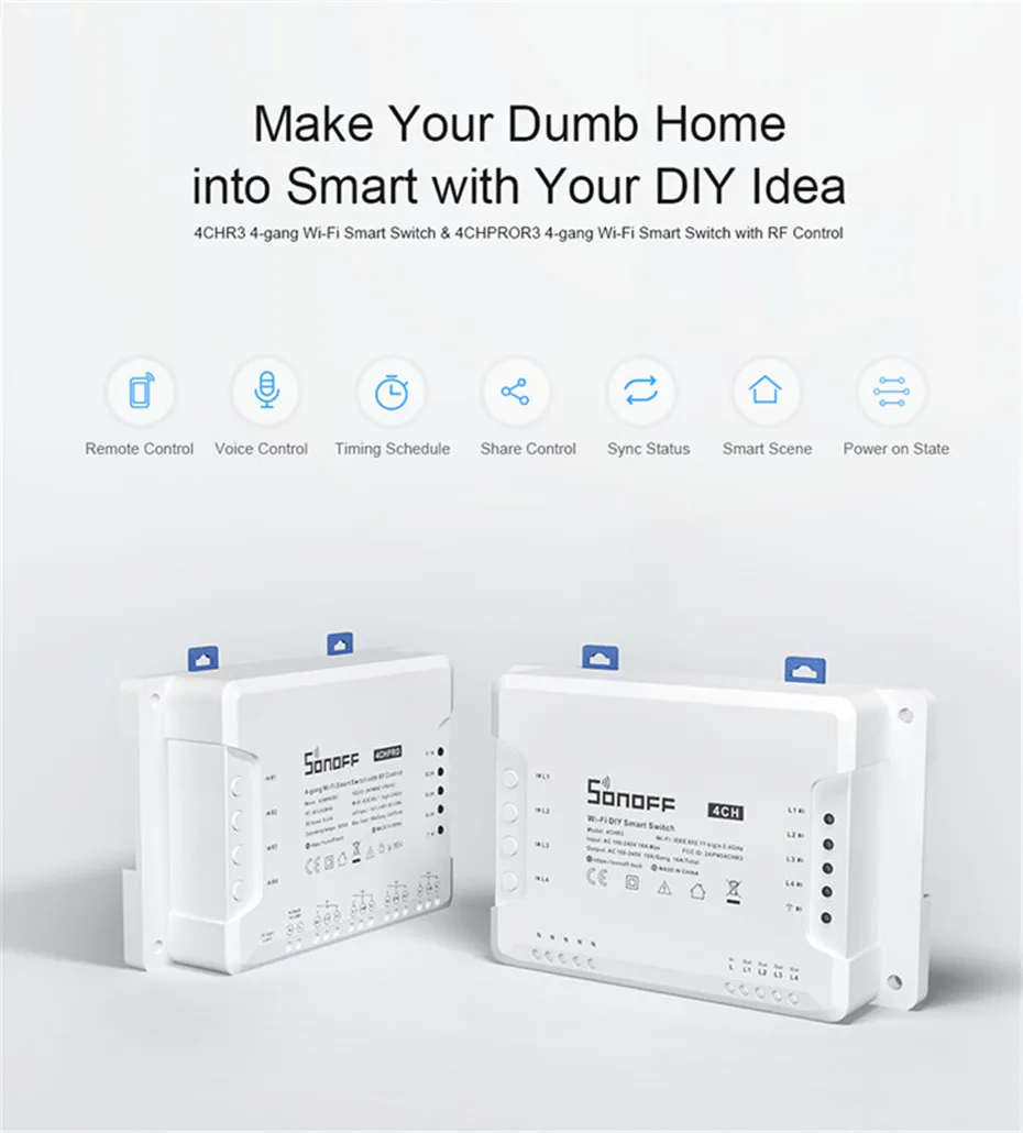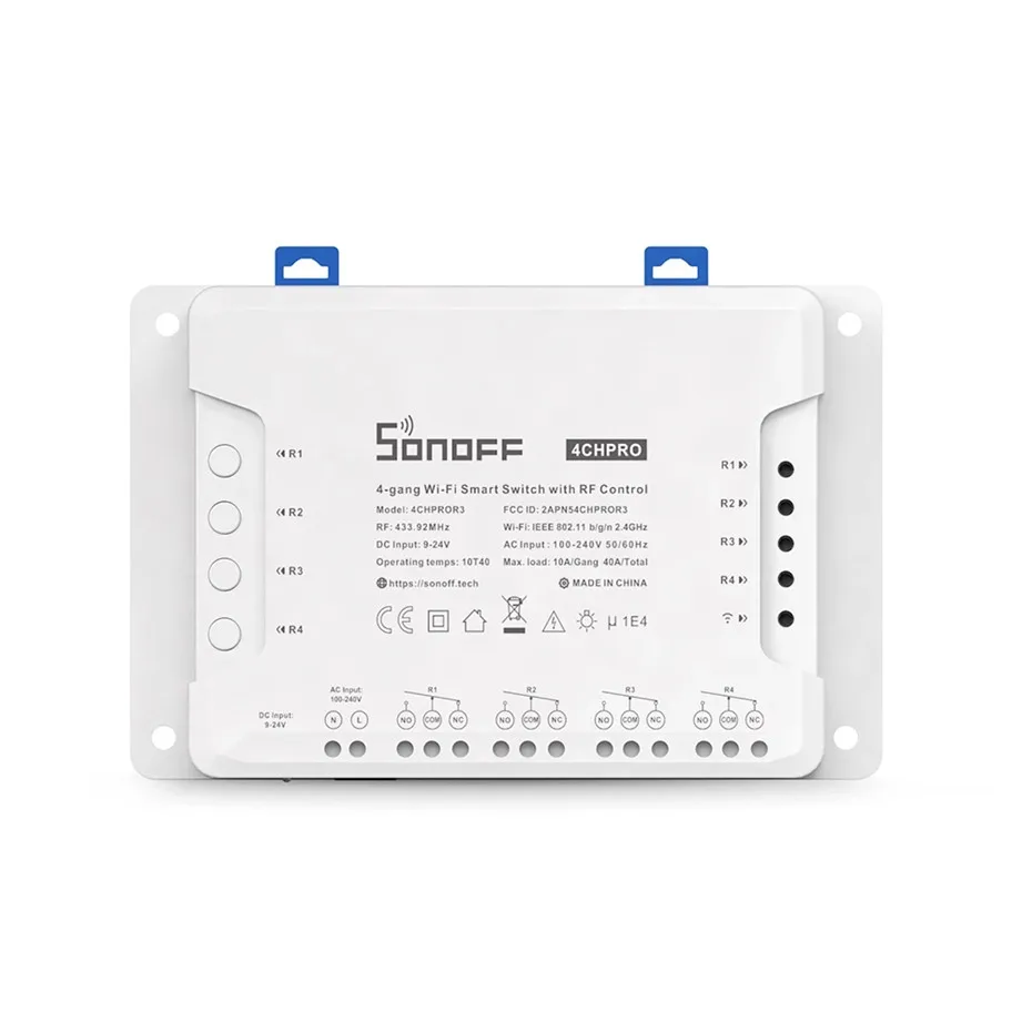 Интеллектуальный выключатель света Sonoff 4CH Pro R3 представляет собой 4-х канальный переключатель Wi-Fi. Поддерживает переключение между 3 режимами работы: inching (0,25-4s регулируемый)