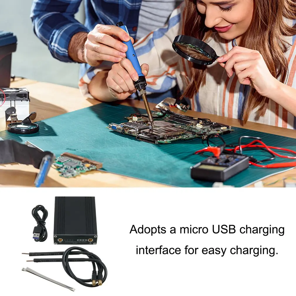 Особенности: 1. Портативный точечный сварочный аппарат, с быстроразъемной сварочной ручкой. 2. Интегрированная паяльная ручка использует клемму с золотой пластиной, с тонкой проводимостью и низким контактным сопротивлением. 3. Поддерживает интерфейс зарядки micro USB для легкой зарядки. 4. Встроенный высокоскоростной аккумулятор 2, с отличными характеристиками заряда и разряда. 5. Тонкая работа и хорошая производительность. 6. Прост в использовании. Длительный срок службы. Описание: 1. Сварочный аппарат точно контролирует выходной ток трубки MOS через микрокомпьютер с одним чипом. Высокая температура более 2000 градусов генерируется в точке сварки, чтобы сделать никелевый лист прочно сварным. 2. Сам сварочный аппарат имеет такие функции, как защита от перегрузки по току, защита от низкого напряжения, защита от перенапряжения и защита от перегрева. 3. Интеллектуальный выходной ток. Его можно использовать безопасно, даже если паяльник короткое замыкание, он не будет поврежден. Характеристики: Материал: металл Встроенный аккумулятор высокой скорости: 5500 мАч Время импульса: 9 уровней регулируется (ключевой цикл) Задержка запуска: 0,5 секунд Требования к адаптерному зарядному устройству: 5 В 2 А Характеристики: Автоматический триггер, съемная паяльная ручка, TYPE-C зарядка, защита от короткого замыкания Дизайн: прочный внешний вид, светильник всплеск ударопрочность, прочное соединение, дисперсии смесителя для пайки ручка, срок службы 50000 циклов. Ячейка: 2 * высокоскоростных ячейки (в комплекте) Выходное напряжение: 4,2 V Макс. Выходной ток: 700A Макс. Цвет: черный корпус, латунная паяльная ручка Размер: прибл. 105*83,2*28,8 мм Посылка включает в себя: 1 х Основной корпус сварочного аппарата (встроенный литиевый аккумулятор, печатная плата и т. д.) 2 x паяльника 2 x мягкий силиконовый провод 1 х никелевый лист 1 x зарядный кабель