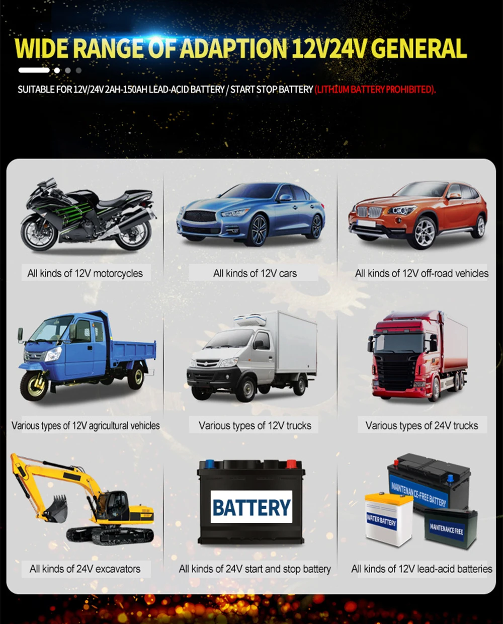 5. Типы аккумуляторов: большинство типов свинцово-кислотных аккумуляторов, включая кальций, гель и AGM, Wet,EFB и т. Д.